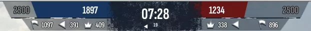 旗帜(侧边):当前领土分数(不累积,会变化)。 向左箭头(侧边):通过占据更多领土以及在突破前线时夺取旗帜累积的分数(100分)。 皇冠(侧边):通过击杀单位累积的分数。 数字2500(侧边):获胜所需的分数。 你的分数(侧边)=下方各项指标之和。 时间(中央):战斗剩余时间。若未达到2500分,则得分更高者获胜。 时间下方的箭头(中央):当前因占据领土而获得每分钟积分的一方。 统计数据(列)