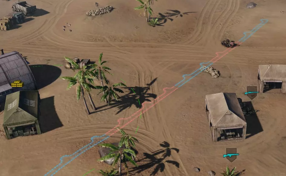 伪装网:使单位避免被航空侦察发现,并降低被点亮的速度。 操作 右键点击弹药:锁定当前弹药类型(直至切换为直接操控模式) Shift+投掷手榴弹:让小组中的单个单位投掷手榴弹(而非全体同时投掷) ??? 小组中的步兵会自动互相传递补给。 载具 点击地面:前往该位置。 点击敌人:向其开火,并继续前往之前指定的目的地。 即可以点击地面移动,同时在移动时点击敌人。 锁定弹药切换:右键点击选择面板上的弹药。例如,AI将只使用穿甲弹和高爆弹进行射击。 火炮有简易射击模式和炮火准备模式。炮火准备模式会提高射速,但无法进行瞄准且精度较低。理论上对区域射击可能有用。 防空有射击模式:地面目标、空中目标。