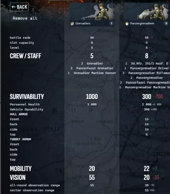 地雷:在敌方领土上(90秒后)会被标记(可见)。 AI寻路会避开已标记的地雷。 已标记的地雷仍可能造成伤害。 任何步兵都可以排除地雷。 地雷上方旗帜颜色含义: - 敌方地雷 - 友方(己方)地雷 - 已标记地雷 ⬜ - 已排除地雷 刺猬:会阻挡坦克通行。 任何步兵都可以拆除刺猬。可用反坦克手榴弹摧毁 如果排成一条直线,也能阻挡步兵 侦察兵和破坏者单位——拥有更远的视野范围和伪装能力 猎兵巡逻犬和步兵分队指挥官:无视伪装加成并能发现隐藏单位——应使用它们来对抗破坏者如果没有哨兵,但有其他AI小队,可以借助指挥官尝试利用它们对抗敌方破坏者。 坦克兵:提升射击精度,加快维修速度。 携带电台的通信兵:若位于目标附近,可缩小友军火炮的杀伤半径。 单位对比模式