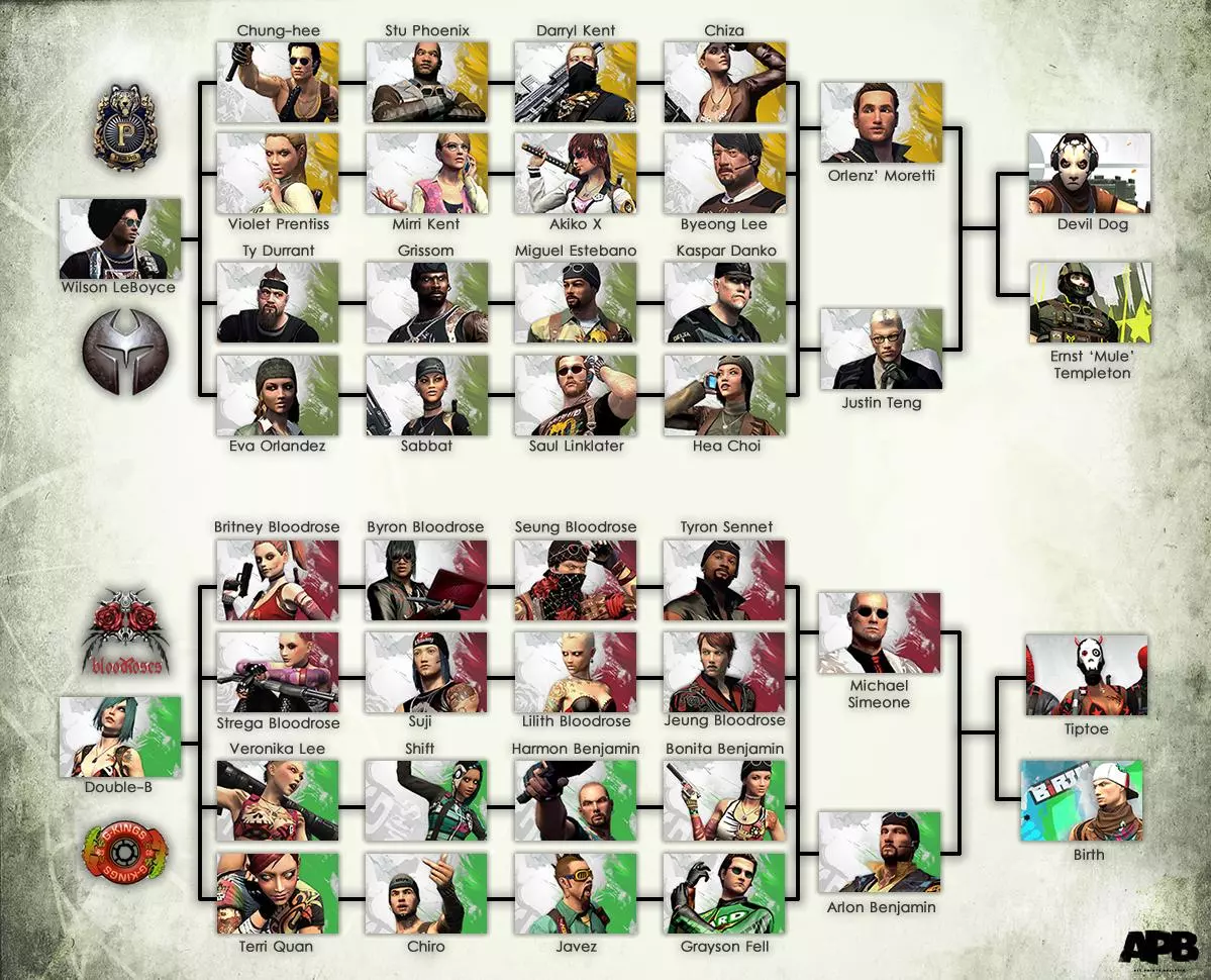 地点: 新手: 威尔逊·勒博伊斯(执法者)- 金融区 双B(罪犯)- 海滨区 执法者: 一阶 郑熙 - 海滨区 维奥莱特·普伦蒂斯 - 金融区 泰·杜兰特 - 金融区 伊娃·奥兰德斯 - 海滨区 二阶 斯图·菲尼克斯 - 海滨区 米丽·肯特 - 金融区 格里索姆 - 金融区 萨巴特 - 海滨区 三阶 达里尔·肯特 - 金融区 秋子X - 海滨区 米格尔·埃斯特巴诺 - 海滨区 索尔·林克莱特 - 金融区 四阶 奇扎 - 金融区 李炳 - 海滨区 卡斯帕·丹科 - 金融区 崔夏 - 海滨区 五阶及六阶 奥伦兹·莫雷蒂 - 海滨区 贾斯汀·滕 - 金融区 恶魔犬 - 金融区 欧内斯特“骡子”坦普尔顿 - 海滨区 罪犯: 一阶 布兰妮·布拉德罗斯 - 海滨区 斯特雷加·布拉德罗斯 - 金融区 维罗妮卡·李 - 金融区 特丽·全 - 海滨区 二阶 拜伦·布拉德罗斯 - 海滨区 苏吉 - 金融区希夫 - 金融区 奇罗 - 滨水区 三阶 承·血玫瑰 - 金融区 莉莉丝·血玫瑰 - 滨水区 哈蒙·本杰明 - 滨水区 贾维斯 - 金融区 四阶 泰伦·森尼特 - 金融区 正·血玫瑰 - 滨水区 博妮塔·本杰明 - 金融区 格雷森·费尔 - 金融区 五阶及六阶 迈克尔·西梅翁 - 滨水区 阿隆·本杰明 - 金融区 蒂普托 - 金融区 伯思 - 滨水区 决赛:阿莱塔·卡达根(ENF) - 金融区 冈博尔(CRIM) - 金融区