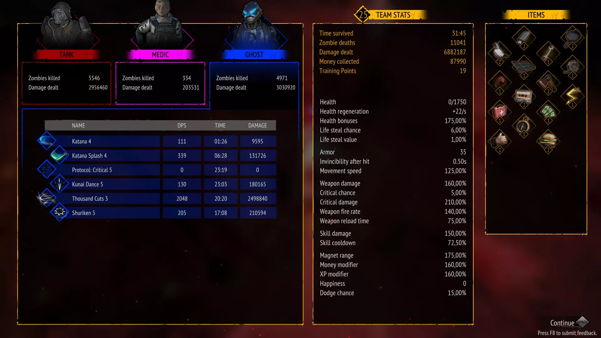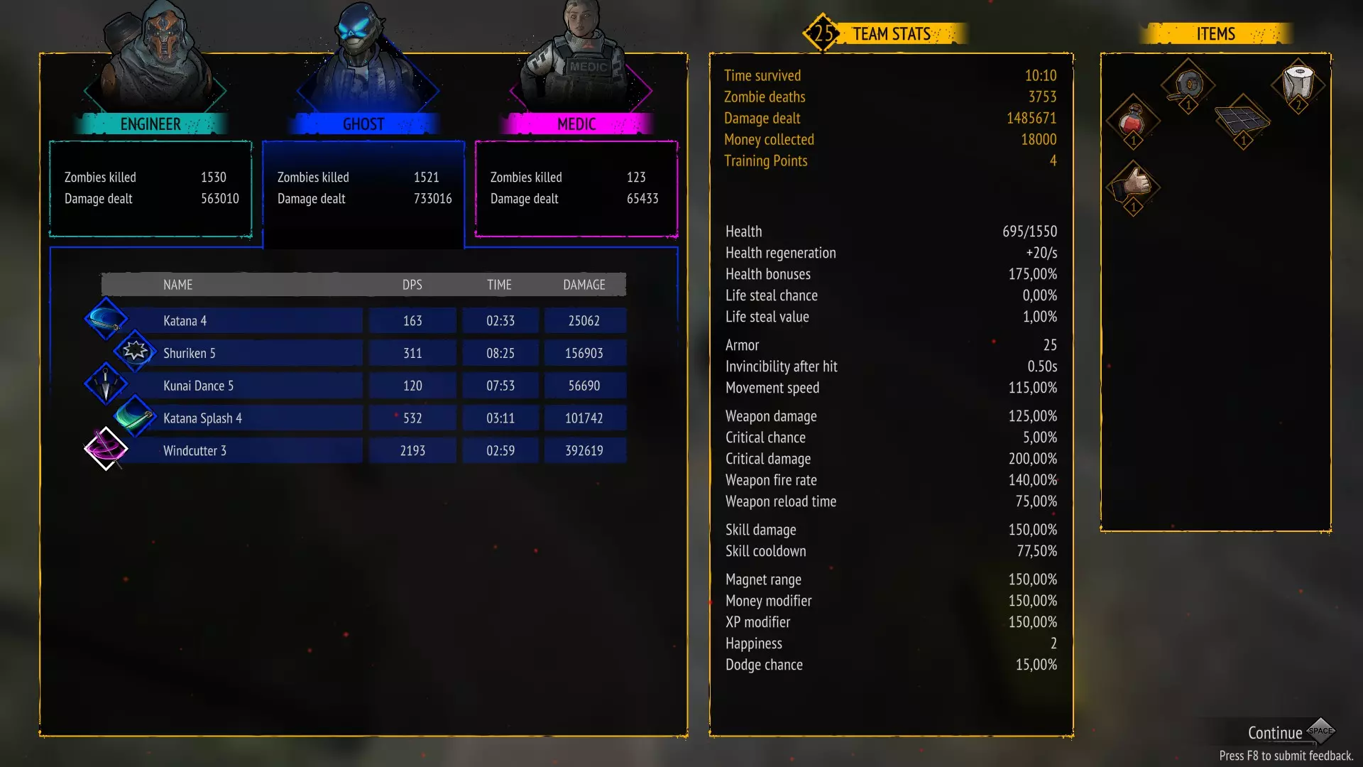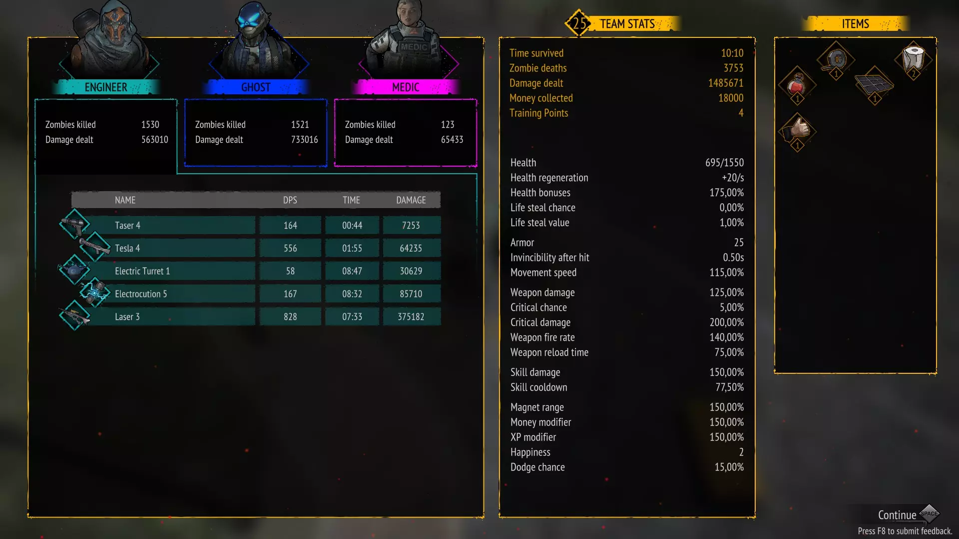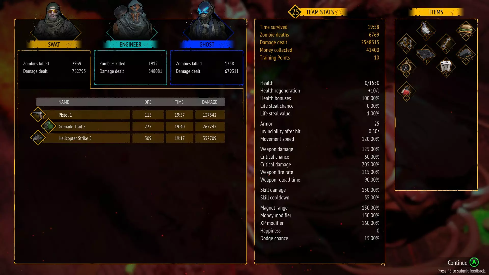 无技能 存活10分钟且不使用任何技能 只需不购买技能即可。 你可以禁用技能并升级武器。 这是我的队伍配置:幽灵 坦克 特警 幽灵作为队长,是游戏中最优秀的角色之一,拥有强大的范围伤害。 装备武士刀的溅射攻击,然后是 坦克,凭借迷你 gun 拥有巨大伤害 特警,使用突击步枪造成高额伤害。 干了这杯 存活10分钟且不升级任何武器 只需不购买武器升级即可。 你可以禁用武器并升级技能。 在橙色箱子中,你可以获取技能强化来优化本局游戏。这是我的队伍组成:特警 / 工程师 / 幽灵 特警作为队长,凭借强化手雷和战斗直升机造成巨额伤害。 工程师作为副手,能加快恢复时间并提供范围伤害:【电击炮塔】(Electric Turret)和【电击脉冲】(Electrocution)。 幽灵是游戏中最强角色之一,拥有巨额范围伤害:苦无 / 手里剑