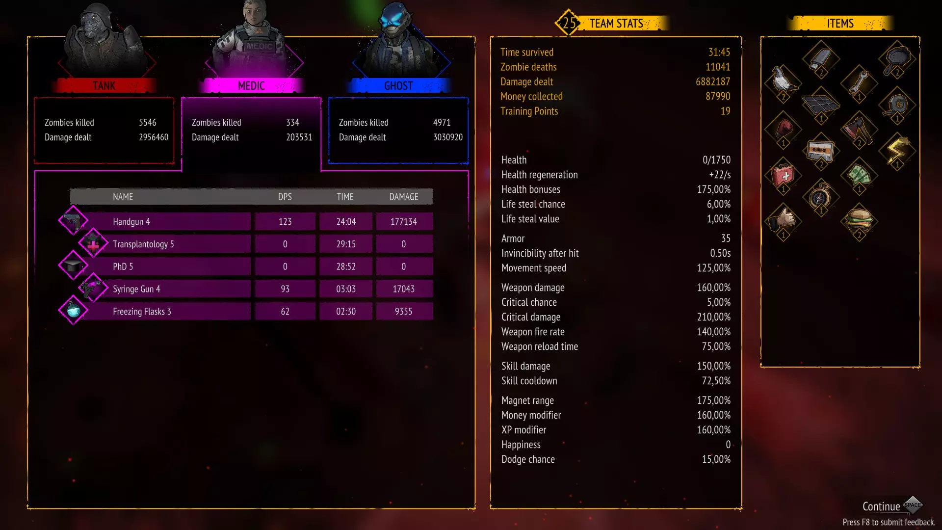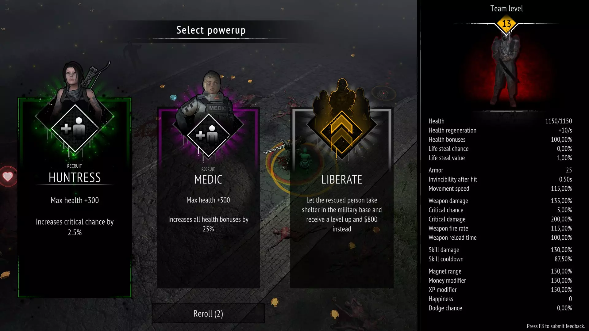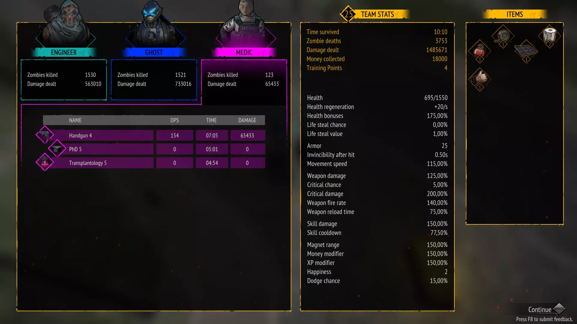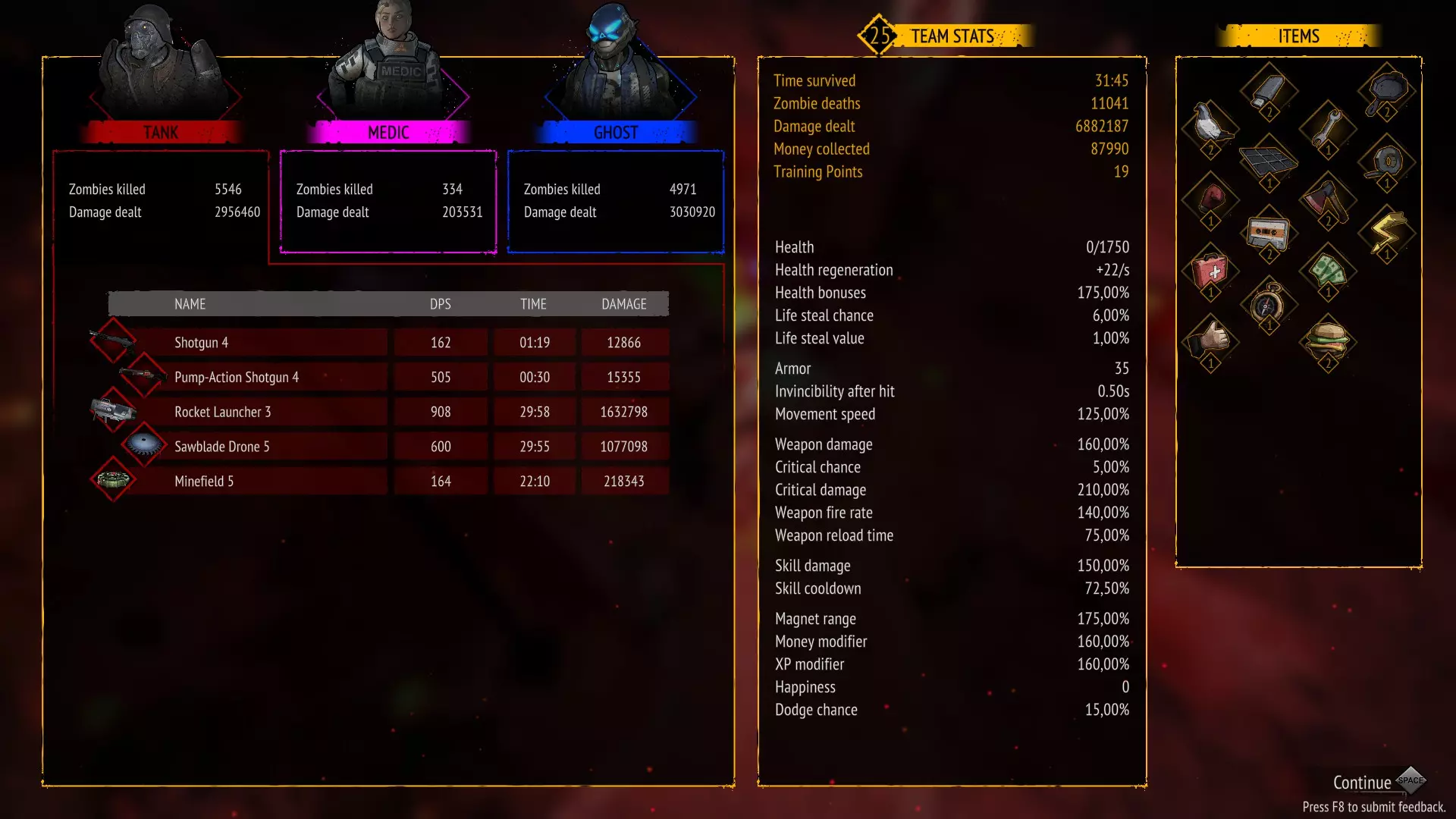 无技能 存活10分钟且不使用任何技能 只需不购买技能即可。 你可以禁用技能并升级武器。 这是我的队伍配置:幽灵 坦克 特警 幽灵作为队长,是游戏中最优秀的角色之一,拥有强大的范围伤害。 装备武士刀的溅射攻击,然后是 坦克,凭借迷你 gun 拥有巨大伤害 特警,使用突击步枪造成高额伤害。 干了这杯 存活10分钟且不升级任何武器 只需不购买武器升级即可。 你可以禁用武器并升级技能。 在橙色箱子中,你可以获取技能强化来优化本局游戏。这是我的队伍组成:特警 / 工程师 / 幽灵 特警作为队长,凭借强化手雷和战斗直升机造成巨额伤害。 工程师作为副手,能加快恢复时间并提供范围伤害:【电击炮塔】(Electric Turret)和【电击脉冲】(Electrocution)。 幽灵是游戏中最强角色之一,拥有巨额范围伤害:苦无 / 手里剑