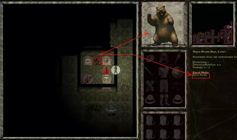好吧!又一家商店……还有……哇哦!店里居然有只熊!没错,在这款游戏里这种事是可能发生的。看来我们不得不战斗了。不过,真的必须战斗吗?我们也可以逃跑。有时候逃跑是更好的选择。 所有熊都有一种名为【先发制人】的特殊能力。这意味着无论你移动到它旁边,还是等它靠近你,熊总会先发动攻击。所有怪物都有某种特殊能力,即使是最简单的动物也不例外。