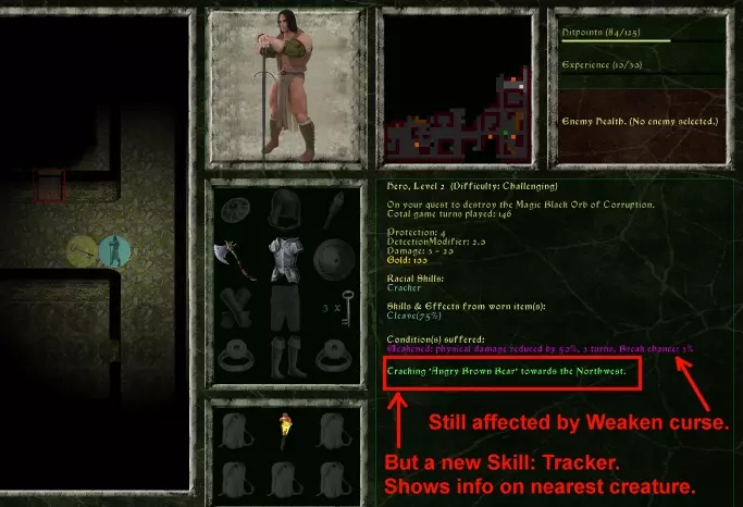如果你在游玩简单/中等难度,你可能会有足够的金币来为角色提升初始技能!通过书籍学习的技能会成为永久性的【种族技能】(与装备绑定的技能不同)。技能书在商店中售价昂贵,但也可以在地下城的宝箱中找到。 进入地下城 当你进入第一个地下城楼层时,请阅读楼层提示并记住它!(在第一层,提示会警告你注意带有陷阱的金币袋。如果你在地上发现金币袋,拾取时要小心。先阅读其描述,它可能包含重要信息。) 你首先看到的很可能是大片的黑暗——未探索区域。随着你探索地下城,黑暗会变成明亮的已探索区域。阴影区域或带有问号的区域通常是已探索过的区域,但当前不在视野范围内。怪物可能潜伏在那里...