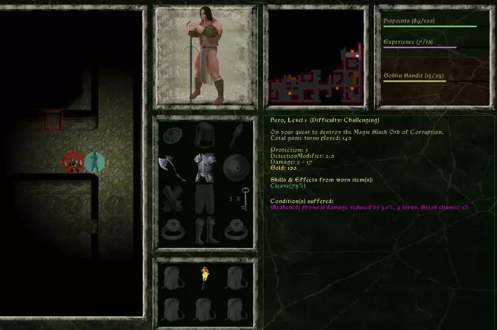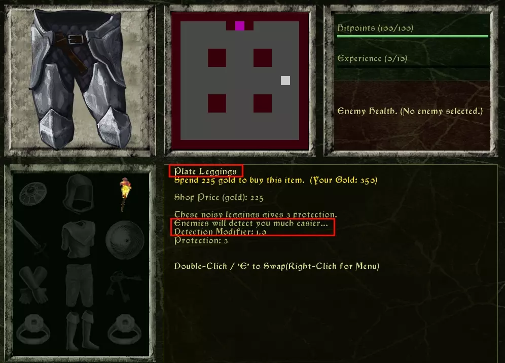 在简单/中等/挑战难度下,下一站是【初始商店】! 将鼠标光标移到物品上可查看其属性。点击物品即可走向该物品,站在物品上时再次点击即可购买。(你也可以使用方向键或W、A、S、D键移动英雄)。 购买一些初始武器可能是个不错的选择(不过并非必须)。每种武器都有一些特殊优势,例如: 匕首是穿刺武器,可无视护甲。 棍棒对骷髅造成双倍伤害。长矛非常强力,兼具穿刺和先攻特性,但价格昂贵,且作为双手武器无法与盾牌搭配使用。 护甲和饰品可以减少敌人攻击造成的伤害。但护甲可能会发出声响……【侦测修正值】为正数意味着你更容易被发现。胸甲虽然能很好地抵御伤害,但在地下城行走时会发出很大的噪音,敌人可能会从额外2格甚至3格的距离发现你!另一方面,布甲的侦测修正值为负数。此外,还有【护甲专家】技能,它能将你的侦测修正值上限控制在0!
