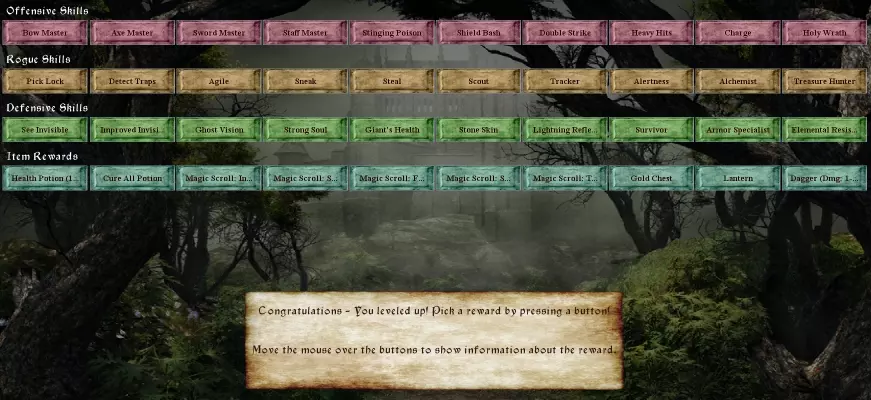 实际上,我们成功了!他没能偷走更多东西,而且我们升级了!如你所见,有许多技能可供选择。并非游戏中的所有技能都能作为升级奖励获得。有些技能只能通过阅读在地牢中找到的技能书来习得。还要注意,最下面一行是物品奖励。所以你实际上可以自由选择一项永久性的新技能作为奖励,或者选择一项物品奖励。100%生命值药水通常是大家想要的,因为我们升级时并没有恢复任何生命值!