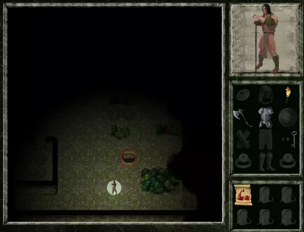 现在我们又探索了一些地方,但这里仍然相当昏暗。一盏好的灯笼或侦察技能能让我们看得更远。这张截图中显示了一个带有红色轮廓的宝箱。从我们的物品栏可以看到,我们确实有一把钥匙。但由于宝箱的轮廓是红色的,这意味着我们没有正确的钥匙。看看物品栏的背包部分,有了新东西。我们找到了一张【虚弱】魔法卷轴。这是一种诅咒,能让怪物在一段时间内造成50%的伤害。有这个还不错……