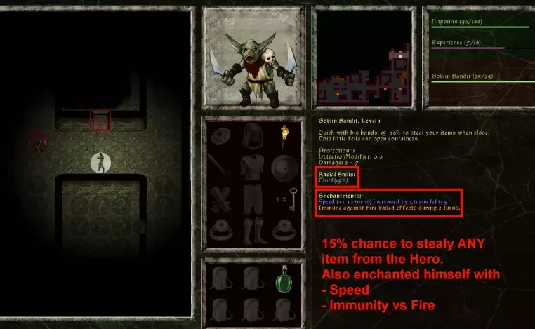 嗯……真倒霉。我们遇到的下一个生物是小偷。游戏里最讨厌的生物之一。他本身不算太危险。问题在于:他每次攻击都有一定几率偷走英雄的任意物品。这里是15%的几率。这意味着……我们可能会失去胸甲……或者匕首……我们还能看到他被速度魔法加持了。这意味着我们不太可能跑过他。看来我们只能迎战了……
