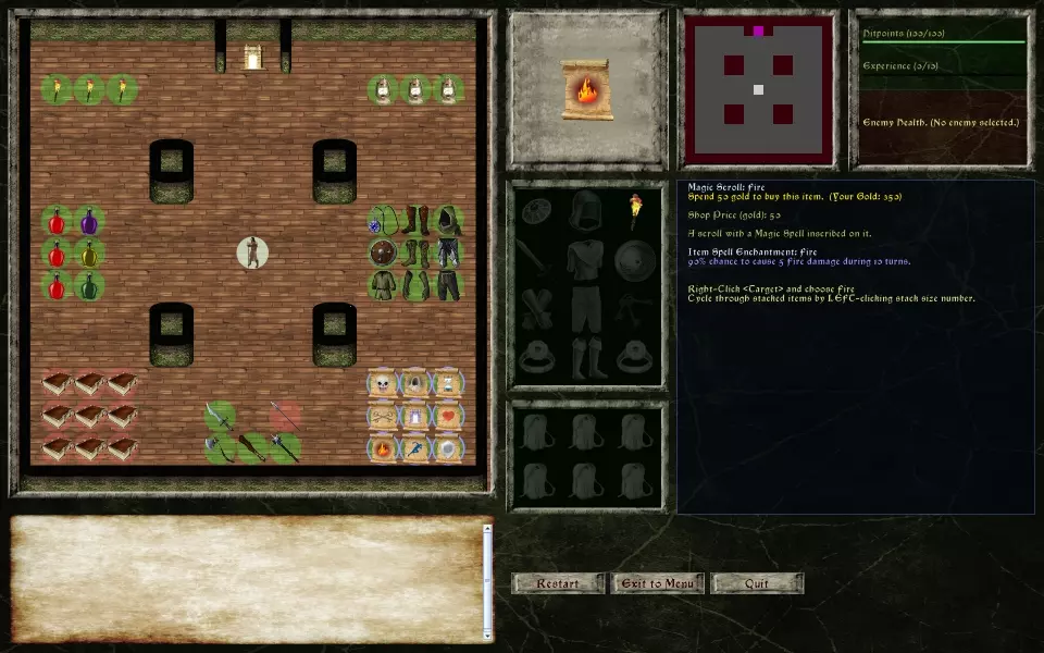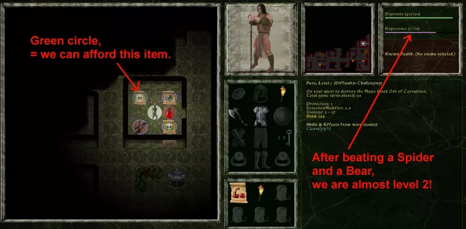 好了,我们打赢了!现在可以稍微放松地逛逛这家商店了。这里有一瓶我们买不起的生命药水。不过,确实有一样东西是我们能买得起的。这里有件物品周围有个绿色圆圈:一张带有疾病免疫法术的魔法卷轴。我不太确定要不要买它。或许还是存钱买治疗药水更好。 看看经验条,已经快满了。这意味着我们很快就要升级了!让我们看看能不能再打败一只怪物然后升级吧!