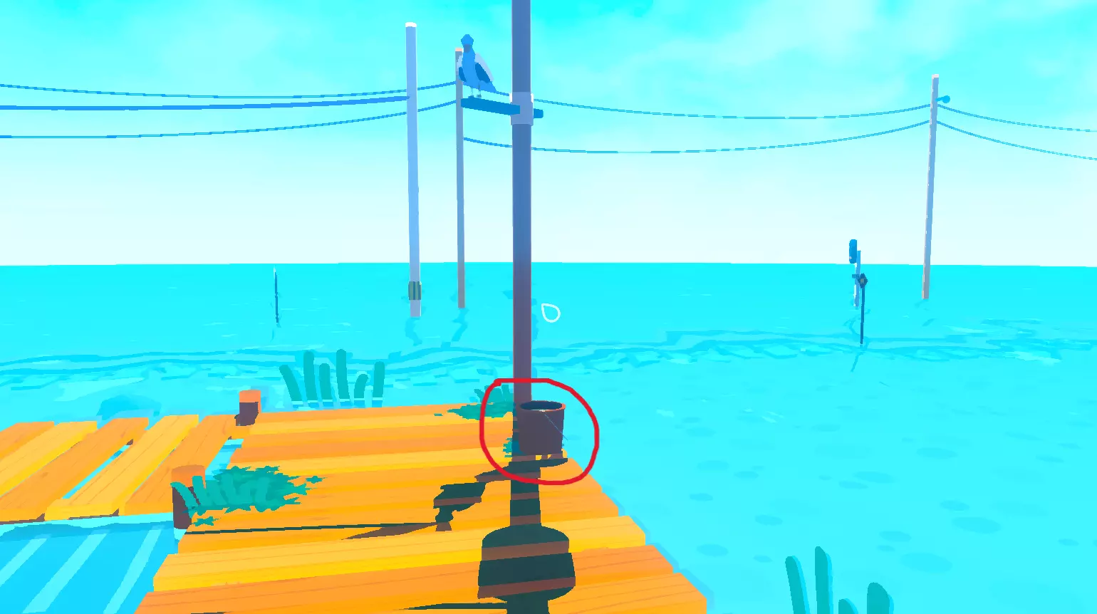 第二个水桶继续走,停在有海鸥的电线杆底下