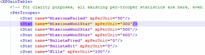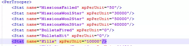 参数: <Stat name="MissionsWon1Star" xpPerUnit="300"/> <Stat name="MissionsWon2Star" xpPerUnit="500"/> <Stat name="MissionsWon3Star" xpPerUnit="600"/> 在末尾添加两个零: <Stat name="MissionsWon1Star" xpPerUnit="30000"/> <Stat name="MissionsWon2Star" xpPerUnit="50000"/> <Stat name="MissionsWon3Star" xpPerUnit="60000"/> 这将使我们在完成第一个任务后达到21级并解锁所有职业。在同一文件的稍下方有一个参数: <Stat name="Kills" xpPerUnit="100"/> 它负责你的单位击杀敌人时获得的经验值,同样加上两个零。这样就完成了,若要恢复原状,反向修改即可。 顺便说一下,最终结果应该是这样的: