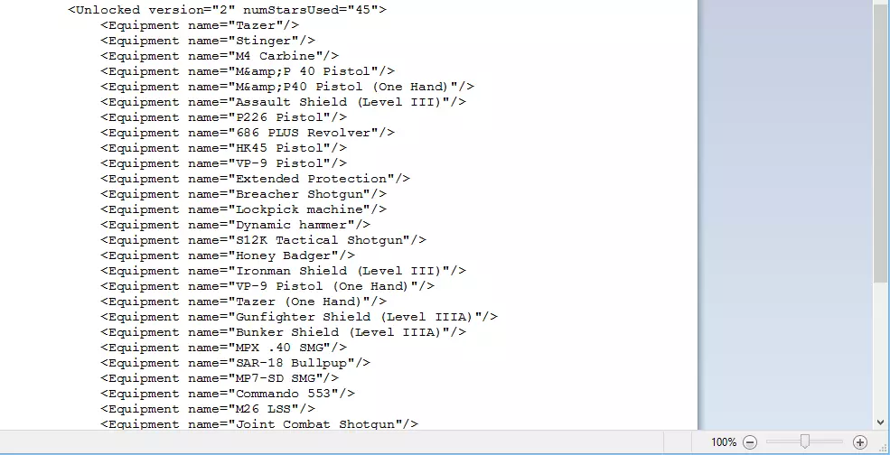 打开并在其中粘贴以下代码,替换原有所有内容:<Unlocked version="2" numStarsUsed="45"> <Equipment name="泰瑟枪"/> <Equipment name="电击枪"/> <Equipment name="M4卡宾枪"/> <Equipment name="M&P 40手枪"/> <Equipment name="M&P40单动手枪"/> <Equipment name="突击盾牌(三级)"/> <Equipment name="P226手枪"/> <Equipment name="686 PLUS左轮手枪"/> <Equipment name="HK45手枪"/> <Equipment name="VP-9手枪"/> <Equipment name="扩展防护"/> <Equipment name="破门霰弹枪"/> <Equipment name="开锁器"/> <Equipment name="破拆锤"/> <Equipment name="S12K战术霰弹枪,蜜獾,钢铁侠护盾(三级),VP-9手枪(单手),泰瑟枪(单手),枪手护盾(IIIA级),掩体护盾(IIIA级),MPX解锁装备:40 SMG、SAR-18 无托步枪、MP7-SD 冲锋枪、Commando 553 突击步枪、M26 LSS 霰弹枪、联合战斗霰弹枪、M870 室内清障霰弹枪、HK416D10 卡宾枪、G36C 突击步枪、UMP45 冲锋枪、MP5SD3 冲锋枪、MPX-SD .40 冲锋枪、UMP45-SD 冲锋枪、轻型护甲、无护甲、突袭者背心、HK45-SD 手枪