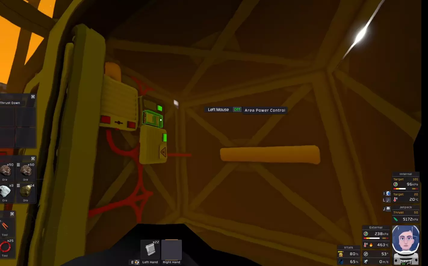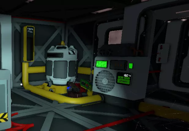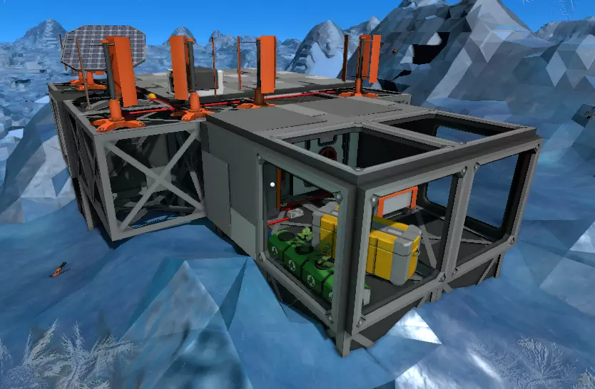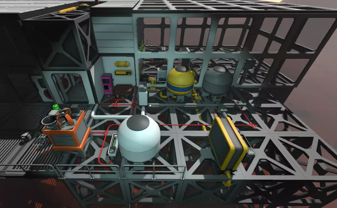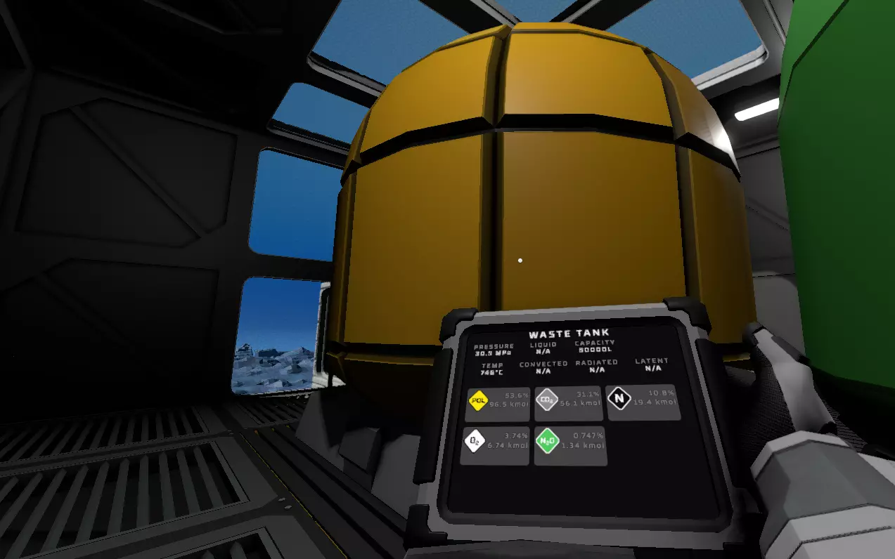 对于空调机组,夜间向其输入127°C的冷空气,并将连接到空调机组废气口的储气罐中的空气加热到140°C以上。这样可以冷却储气罐内的空气。这里有一个你可以使用的脚本。 为了减缓氧气消耗,应尽快用提供的水罐建造一个单方块温室。种植12株土豆后,你将开始产生净氧气,因此最好尽快种植它们。