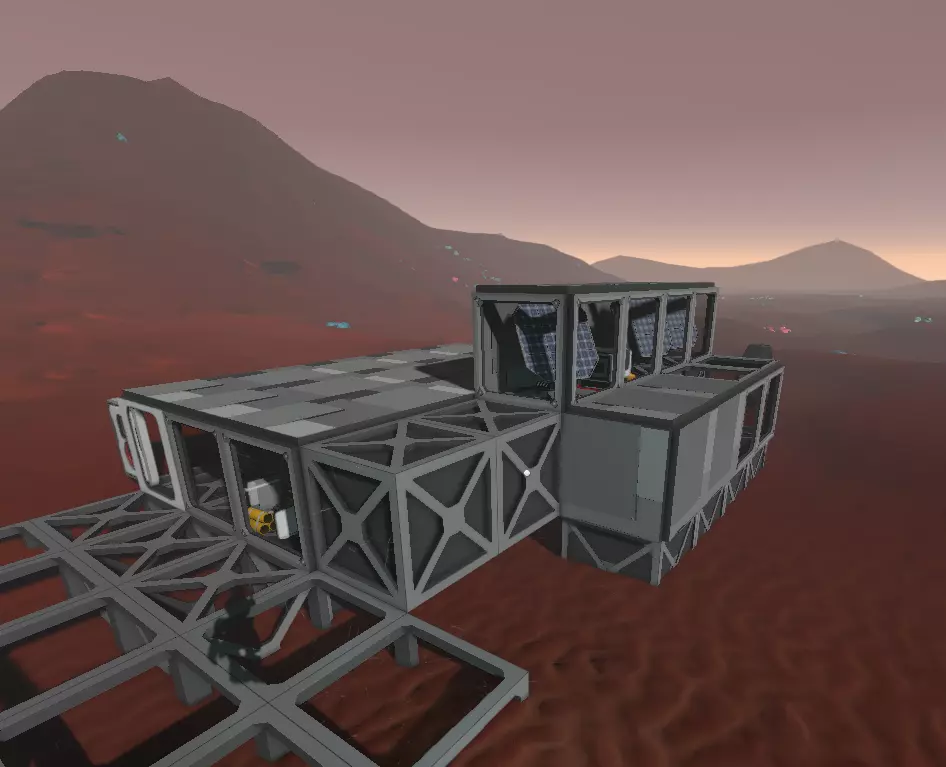 尽早升级到双轴太阳追踪系统。火星上的太阳能强度很高,不过还不及月球。尽管如此,为温室降温仍是重要的优先事项。如果你愿意,可以跳过设置碎冰机来获取氧气,直接采用大气过滤法。剩余的二氧化碳和氮气可用于为你的种植基地增压,而污染物会凝结析出,留下优质的冷却剂。以下是一个示例。