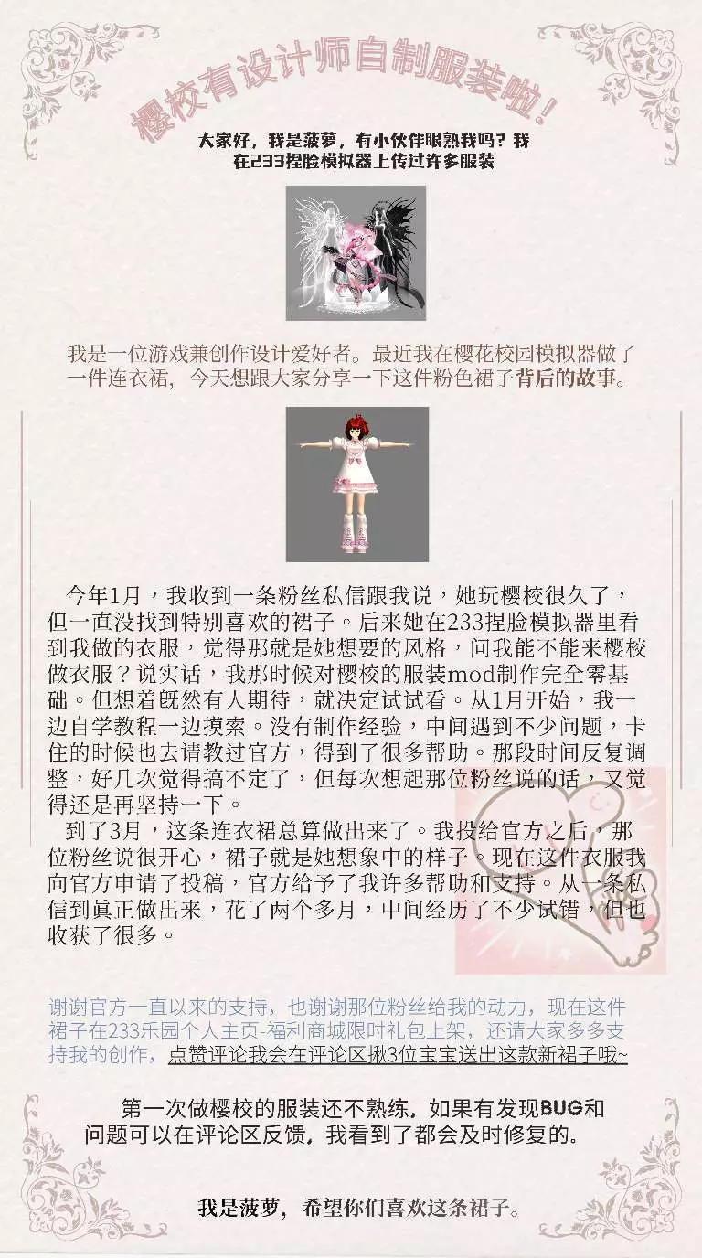 大家好,我是菠萝,有小伙伴眼熟我吗?我在233捏脸模拟器上传过许多服装。