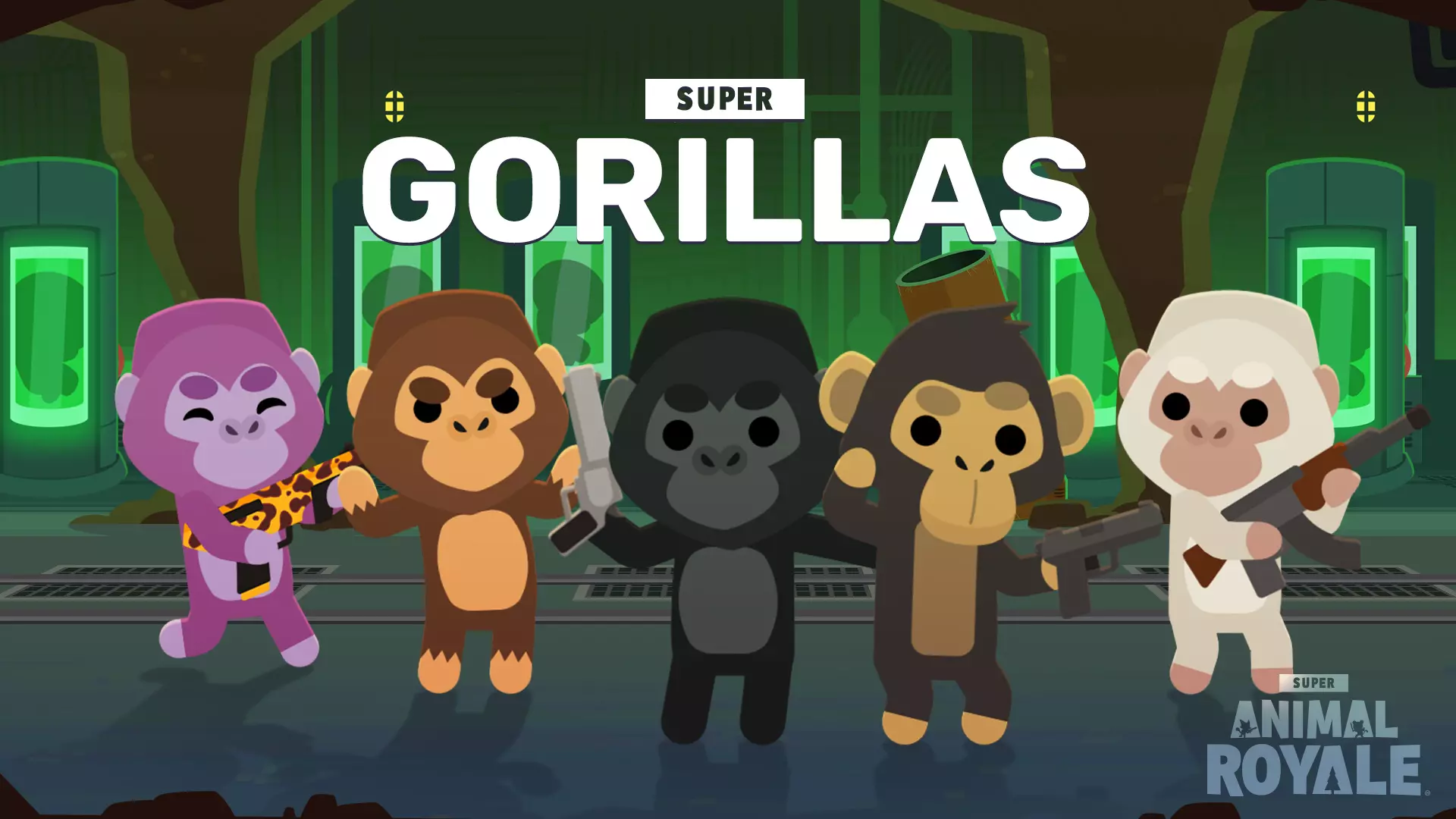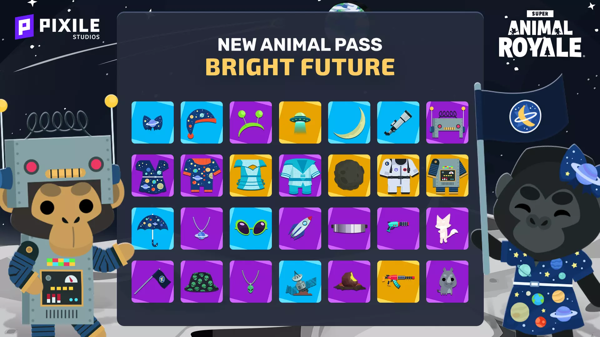 无需再倒数:光明未来更新现已上线!一块香蕉石陨石坠落在岛上,开启了全新的故事线,带来了新任务、新武器和新机制,以及一系列社区请求的改进。以下是完整更新说明前的快速概述: 亮点: 1. 一块香蕉石陨石已降临超级动物世界,带来了新的NPC、故事线和任务 2. 动物 Royale 中出现了香蕉祭坛,供奉香蕉和巨型鸸鹋可能会获得奖励,也可能受到惩罚 3. 全新的X光炮、乌兹冲锋枪和可双持的双持乌兹已加入游戏,同时还有新的特色武器轮换系统,让比赛保持新鲜感 4. 热门模式、再来一局、自动接受队列和自定义搜索栏只是本次更新中部分社区请求的改进 5. 全新的光明未来通行证和光明未来起始包将本季的复古未来科幻主题变为现实 6. 重生日回归,带来三周的蛋、挑战、奖励以及新的超级云臭鼬超级大猩猩、超级黑猩猩和“外星”品种现已在研究实验室解锁。同时,通过Twitch掉落活动,限时推出四种全新超级动物。本次更新还包含诸多内容,包括全新的沼泽微风仓鼠球赛道、香蕉蟹、商店更新,以及大量游戏玩法、社交中心和用户界面的优化(还有Makeship plush的预告)。
