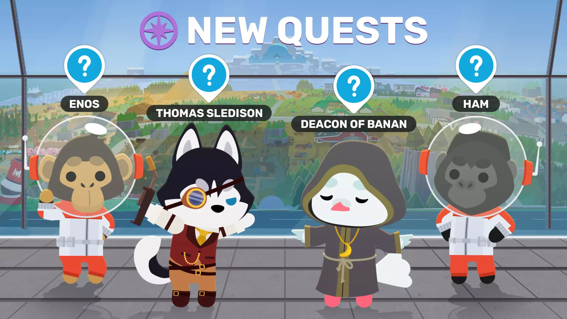 在SAW实验室的东北部,一块巨大的陨石坠落了,岛上的各个派系对其意义有着截然不同的看法。 这块陨石中含有一种奇特且充满活力的新材料,名为【香蕉石】。托马斯·史莱迪森迫切地想在他的工坊里尽可能多地开采这种矿石用于武器研发,他坚信这能催生出各种奇妙又危险的新发明。与此同时,香蕉教则认为这块香蕉石陨石具有更为神圣的意义,其碎片呈现出的黄色、柔和弯曲的形状,似乎也印证了他们的虔诚并非毫无根据。 而被它吸引的,并非只有他们。超级猿猴太空协会应运而生,这是一个由超级猿类哈姆和埃诺斯创立的热心新太空爱好者俱乐部,他们坚信这颗流星预示着超级动物种族在星际间的光明未来。