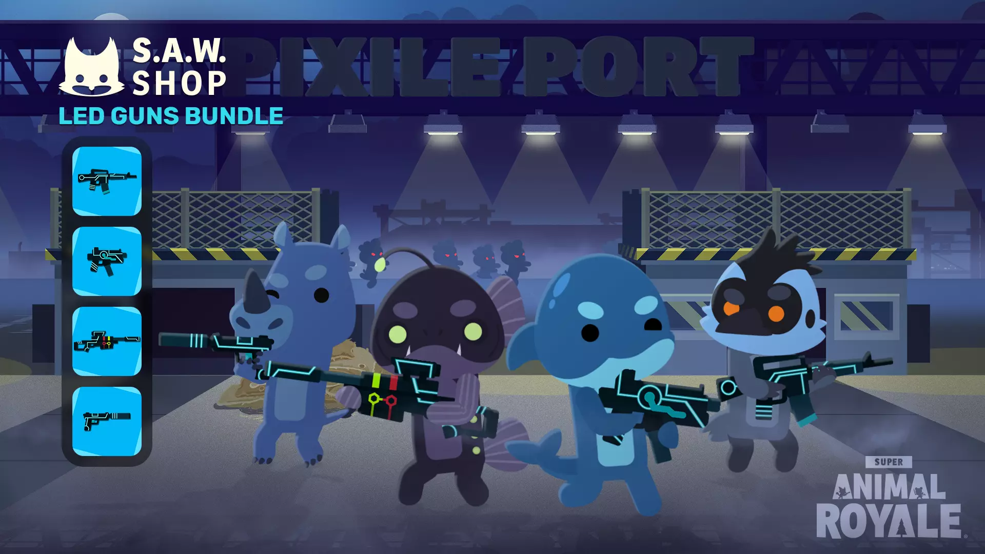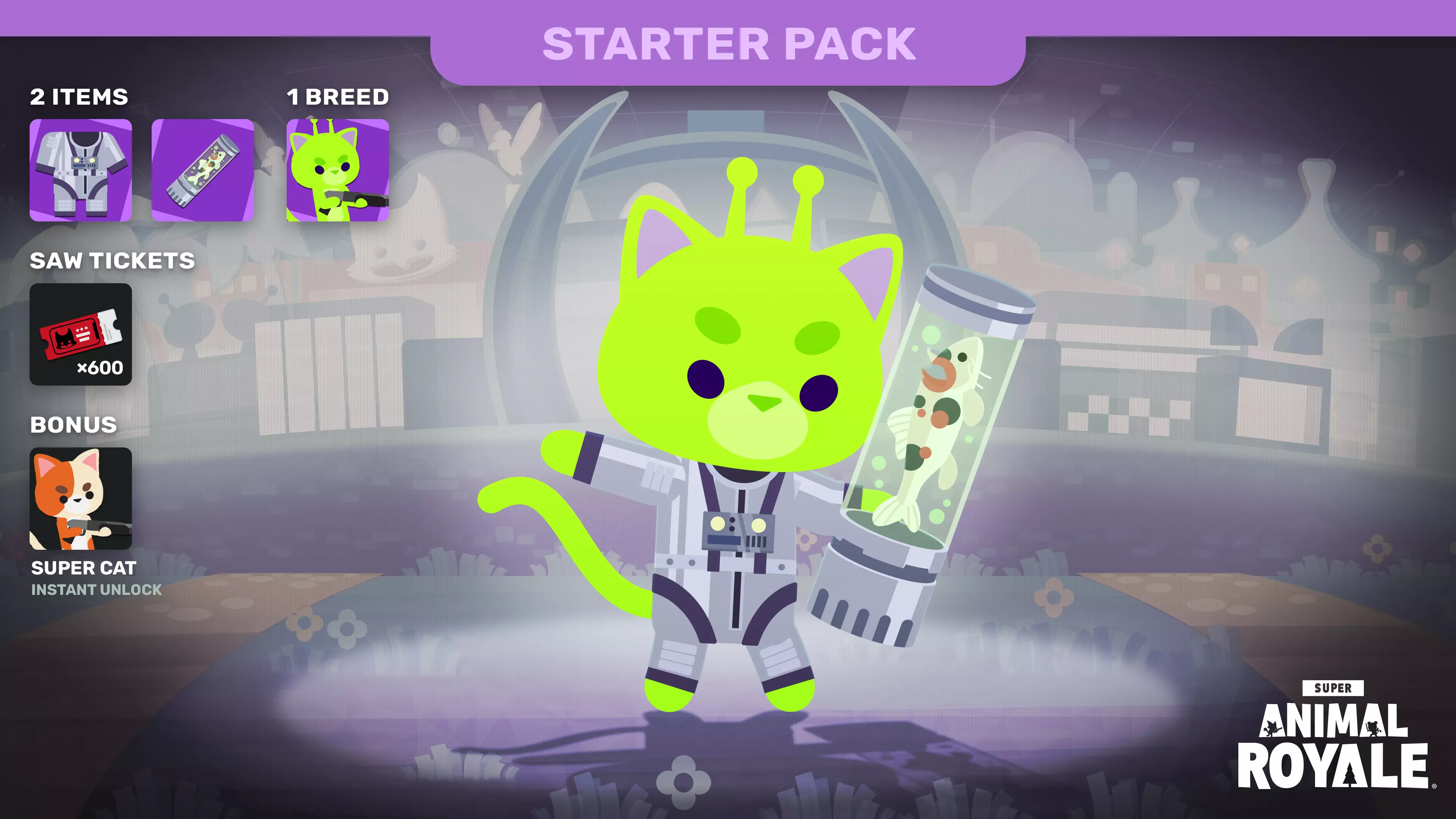 《超级动物 Royale》更新内容 1.【光明未来新手包】包含以下内容: - 超级外星猫 - 外星宇航服 - 外星样本 - 600 SAW 票券 2.与超级动物世界扩展包一同推出的【盛大开幕新手包】将在一周后进入宝库。我们计划未来以新形式重新推出过往赛季的新手包,但如果你一直想获取这个包,现在正是时候。 3.新增武器:乌兹冲锋枪、双持乌兹冲锋枪以及X光加农炮