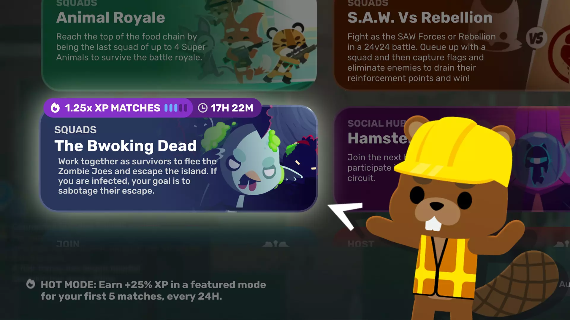 热门模式现已上线!每24小时,将有一个游戏模式被标记为当日热门模式。在该模式下进行的前5场比赛,你将获得额外25%的经验值!而且即使你早早被淘汰也无需太过担心,完成热门模式比赛后你总能获得至少100点经验值。 我们推出热门模式的目的是通过小额奖励鼓励每日精选模式的大厅人数更充足,同时保持其可选性。我们会持续关注该模式的运行情况,也非常想听听你对目前运行效果的看法,以及未来更新中你希望看到的类似功能。更多社区特色请求 我们还添加了一些社区要求的改进,这些改进是我们从大家那里经常听到的,旨在让核心模式和社交中心之间的切换更加流畅,导航更加便捷。 【再来一局】功能允许队伍主机在队伍返回大厅后自动重新排队所有人,这样你无需打开模式界面就能立即重新排队。你也可以通过打开游戏模式界面来取消该操作。注意:观战按钮已移至结算界面的右下角,仍可通过按ESC键触发。 【自动接受排队】功能现已上线并默认启用,设有10秒取消窗口,让你可以轻松完成手头的事情,同时避免错过比赛。如果你更喜欢旧版的手动排队流程,可以在游戏模式界面切换回去。 我们终于在MTN工作站的自定义和表情界面添加了搜索栏!游戏中拥有超过2000种外观物品,这是一个非常实用且长期以来备受期待的功能。 BananOS社交界面现在包含最近和附近的玩家,以便更轻松地添加好友、举报或静音。 现在可以直接从好友的个人资料加入他们的社交中心(这是双向的,不仅限于派对主持人)。 下面还列出了更多改进和新功能,我们仍计划在未来的版本中为BananOS添加更多内容。请继续提供反馈,我们将不断完善它! SAW商店新增内容