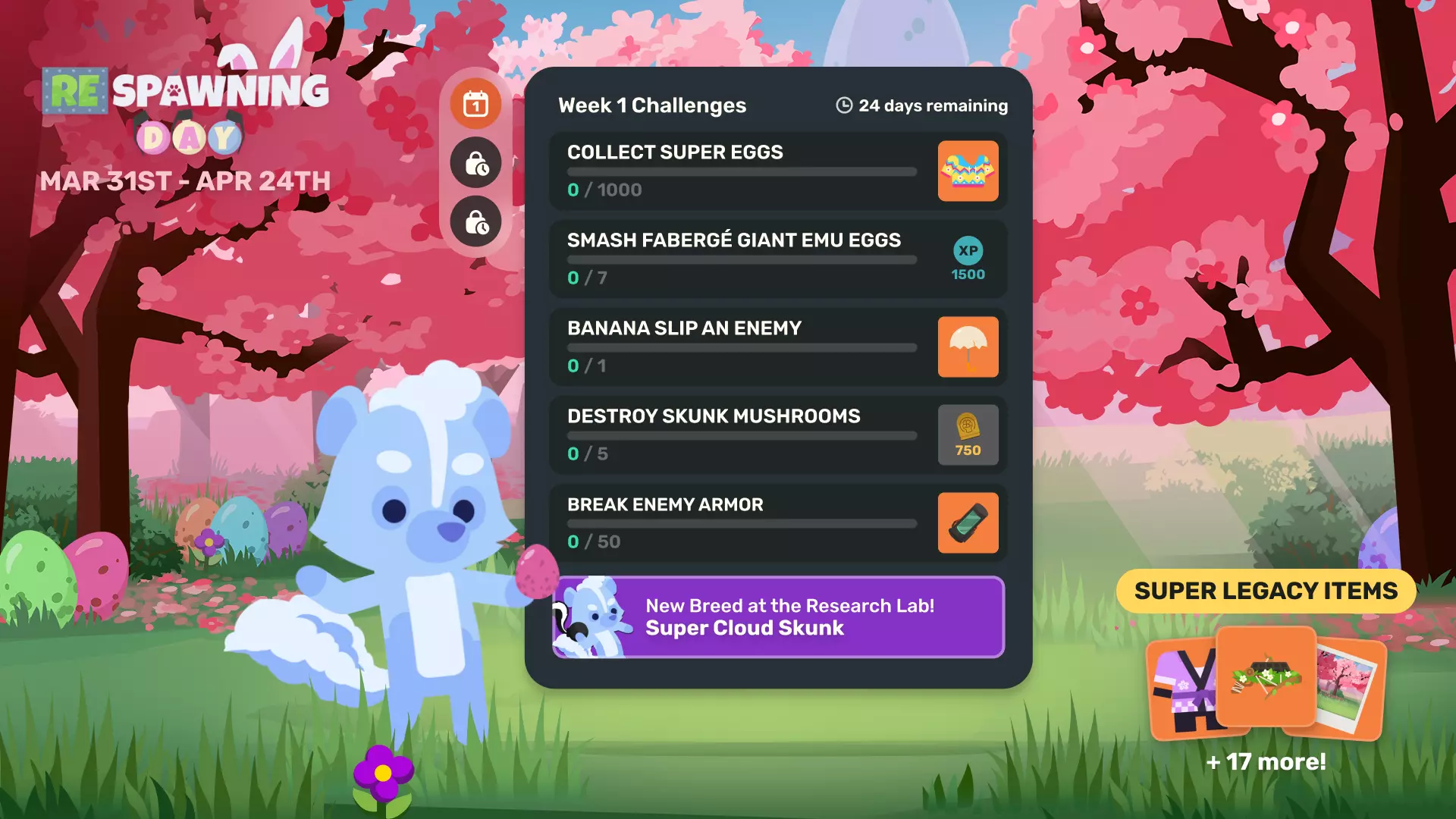实验室的研究员们认为岛上居民对星空的痴迷还需要更多“访客”,于是他们通过生物工程创造了一整个入侵部队规模的全新“外星”超级动物品种。 现在可在研究实验室中获取(每个品种旁列出了所需解锁等级): 超级外星蝙蝠(80级) 超级外星毛丝鼠(50级) 超级外星奶牛(40级) 重生日活动回归,带来为期3周的挑战。