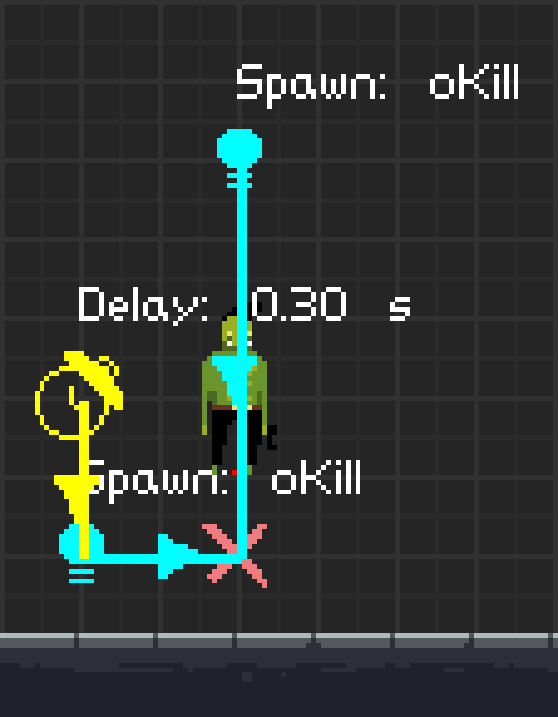 延迟生成 延迟生成用于在特定目标完成时生成敌人。首先,将图标放置在敌人身上。然后打开其下拉菜单并点击生成时间。输入任意数字。当达成该目标时,敌人就会生成。 强制击杀 正如其名称所示,此工具可以强制非玩家角色死亡。 只需将强制击杀图标放置在你想要使其死亡的非玩家角色身上即可! 还有两种不同的击杀类型供你选择。打开下拉菜单即可使用它们。普通类型会简单地将敌人变为 ragdoll(布娃娃)状态。而暴力类型则会残忍地将其斩首,鲜血从残缺的身体中涌出。 如果设置敌人在特定目标完成后生成,一旦敌人生成,强制击杀仍然对其有效。