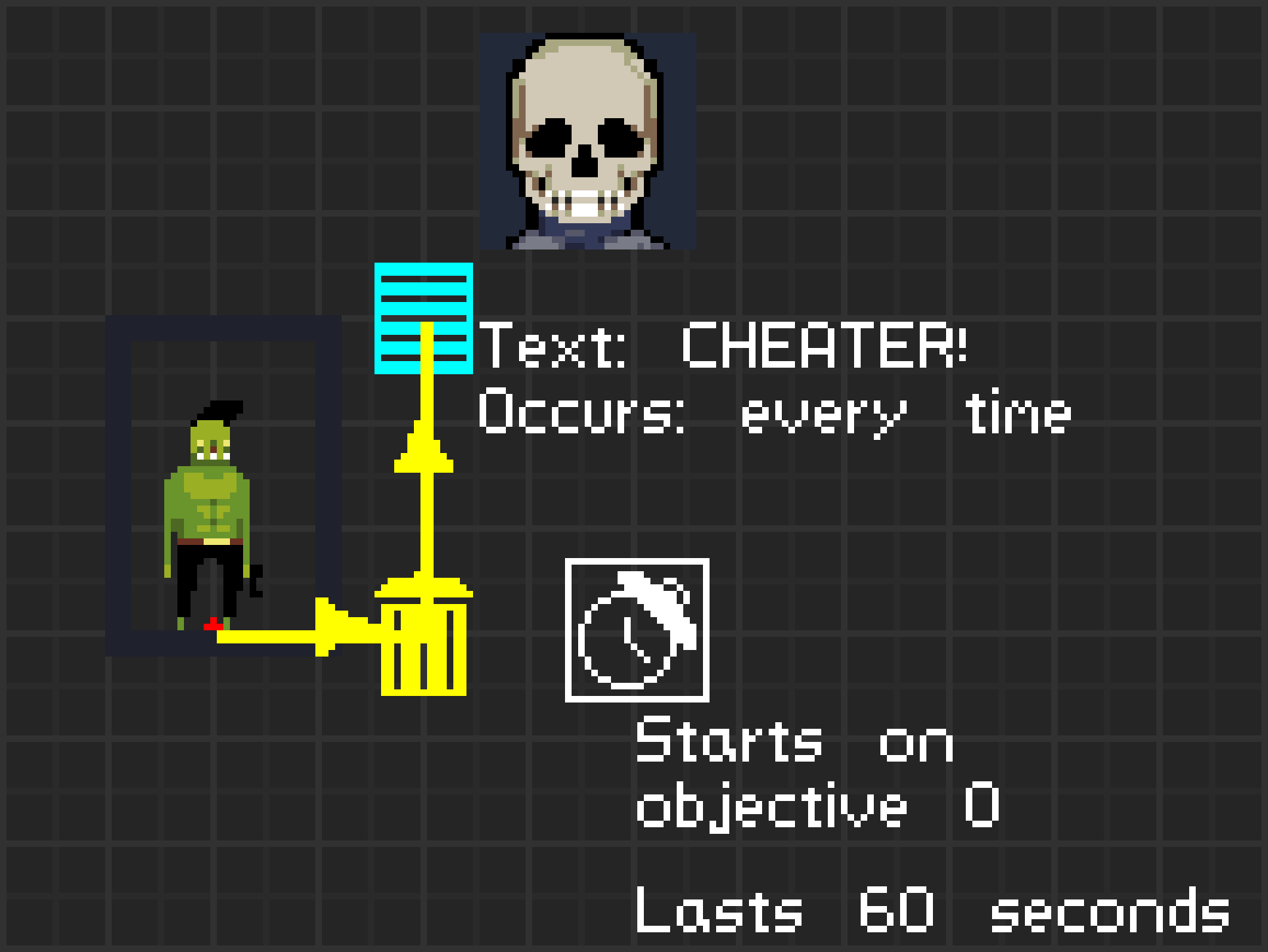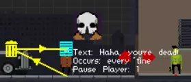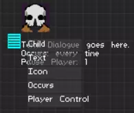 文本决定过场动画的对话内容。图标提供可选的角色头像(将军、僵尸监控摄像头、瓦尔和斯特拉爵士除外)。触发设置可选择过场动画是每次运行都出现还是仅首次出现。最后,玩家控制本应决定过场动画期间玩家是否可以移动,但遗憾的是该功能无效,所有过场动画都会使玩家暂停。