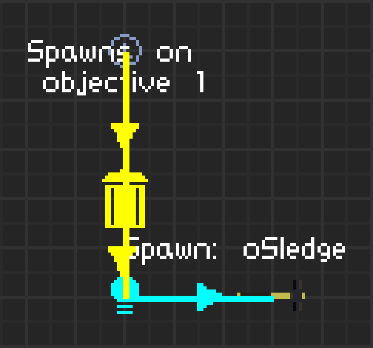 父子关系 在前面几段中,我多次提到了“父项”和“子项”这两个词。事实上,父子系统是整个触发系统的基础。 你可能会注意到,四个触发系统工具的下拉菜单中都有一个“子项”选项。点击该选项后,你接下来点击的对象将成为它们的子项。一条黄色或蓝色的线条(取决于你使用的是触发器还是命令)会出现,连接父项和子项。这就是我所说的父子链。 对于不同的工具,子项的含义有所不同。对于命令(生成),子项就是你想要生成的对象。对于命令(过场动画),子项功能与触发器类似。当过场动画结束后,子项将被激活。这个子项可以作为另一个过场动画,用于连接过场动画。需要注意的是,如果触发器或命令没有父项,那么它会在关卡开始时立即激活。因此,如果你想让关卡以过场动画开始,只需放置过场动画且不设置父项即可。 下面是一些使用触发器系统的父项链示例。 第一个示例如下所示。
