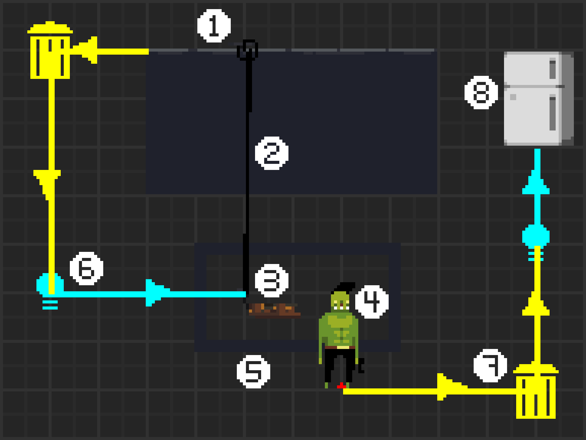 哦,真是一团乱。让我来梳理一下。 1) 探测器:这是实际触发装置的部件。对于 proximity 触发方式,会用到压力板,但它也可以是掩体、电灯开关以及大多数其他可交互物体。 2) 陷阱激活器:连接探测器和陷阱的线路。其激活延迟(触发陷阱所需的时间)仅根据它与陷阱的水平距离而变化。如果你将这个距离尽可能缩小,但不要形成一条垂直直线,探测器几乎就能瞬间触发。 3) 陷阱:用于杀死目标的陷阱。可以是手榴弹陷阱或霰弹枪陷阱。 4) 目标:即将被陷阱杀死的测试对象。可以是任何敌人或地雷。 5) 边界盒:一个紧凑的小房间。用于确保陷阱和目标的安全。6) 生成线路:这个小机制会让陷阱仅在街道方块被摧毁时生成。这会使陷阱及其线路不可见,但陷阱本身仍能正常运作。由于上述街道方块无法被摧毁,这意味着陷阱会永久保持这种状态。这样做是为了确保玩家不会被陷阱线路所迷惑。 7) 信号转换器:通过检测目标的死亡,我们可以获得一个触发系统信号,这个信号可以用于任何我们想使用的地方。 8) 输出端:电路的末端可以是任何你想要的东西。最好不是冰箱。 基于以上设定,让我们来演示一遍流程! 有人触发了顶部的压力板、盖子、电灯开关或其他类似装置。这会通过隐形线路发送一个信号,触发陷阱,从而消灭附近的目标。这种破坏会激活一个破坏触发器,随后会生成一个冰箱。 钥匙卡方法:
