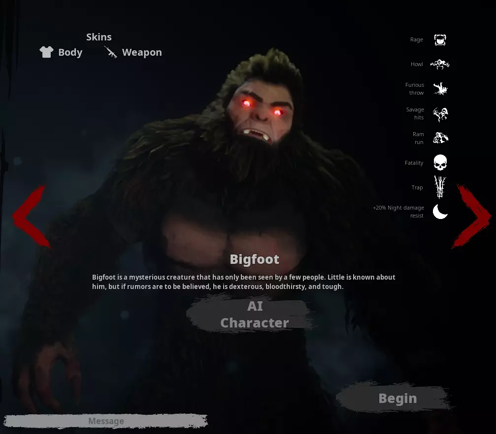大脚怪 描述:“大脚怪是一种神秘生物,仅有少数人目击过它。人们对它知之甚少,但如果传言可信的话,它身手敏捷、嗜血且皮糙肉厚。” 额外加成:夜间伤害抗性+20%。 特殊能力:树木陷阱、狂怒、狂怒投掷、野蛮打击、冲撞冲锋、终结技。 玩法策略:在在线团队对战玩家模式中,你可以扮演传说中的大脚怪。它天生体型庞大,能快速奔跑和高高跳跃;但由于主要局限于近战,大脚怪的战斗选择有限……这意味着扮演大脚怪的1名玩家需要小心,避免被4名对手围殴。 大脚怪可以通过猎杀公园里的动物或吃垃圾来恢复生命值,不过猎杀的收益要高得多。捕获的猎物可恢复约50点生命值,而垃圾桶仅能恢复约4点生命值。注意:在进食动物时,大脚怪会陷入约5秒的动画僵直,因此如果你想治疗,确保周围没有人。 当猎人布设陷阱后,若大脚怪靠近肉类,就会被引诱过去,此时必须通过快速反应事件才能逃脱。如果未能成功,他就会走向肉类,很可能会被捕兽夹夹住。所以在白天要格外小心。他还能通过追踪气味痕迹轻松追踪动物或猎人。 团队协作 如果你独自游玩,需要注意无法与他人分享物品;但在线游玩时,你需要与队友合理分配资源。通常情况下,某些角色应优先获得物品和武器。所有人 - 雷明顿700步枪、7.62毫米弹药、格洛克17手枪、9毫米弹药、陷阱与肉、相机、无人机、图腾 瑞克 - M4步枪、5.56毫米弹药、雷明顿870霰弹枪、12号口径霰弹、AWM狙击步枪、7.62毫米弹药、棒球棍、管钳、撬棍、砍刀、大斧头 杰西卡 - 雷明顿870霰弹枪、12号口径霰弹、AWM狙击步枪、7.62毫米弹药、医疗包、陷阱与肉、相机 托马斯 - 格洛克17手枪、9毫米弹药、炸药、丙烷罐、汽油罐、汽车电池、烟花 威廉 - AWM狙击步枪、7.62毫米弹药、信号枪、信号枪弹药、信号弹、烟花 团队合作是击败大脚怪的关键,因此要记住每个角色的优势和劣势,并了解哪些物品对谁有益。瑞克玩家应该获得M4步枪或雷明顿870霰弹枪,他们的首要任务是获取这些武器。托马斯应该搜寻爆炸物,如果可能的话再找一把R870;因为他需要近距离协助团队对抗坦克。 杰西卡和威廉应该为团队进行探索,设置陷阱和摄像头,并收集偏僻位置的资源。一旦地图探索完毕,分配装备,然后组队行动……白天单独探索相对安全,但当夜晚来临时,一定要待在一起。 选择你的武器 - 近战 选择合适的工具 《大脚怪》中的武器在实用性和威力上差异很大;因此,注意在任何情况下的最佳选择,并根据武器的价值提升来挑选它们非常重要。 从一开始,在营地时,你会拥有一把猎刀,并且可以在露营车里找到格洛克手枪、信号枪和雷明顿700步枪。游戏中也遍布着可用来对抗大脚怪的陷阱。那么,言归正传: 近战武器 通常不建议使用近战武器,因为靠近大脚怪会有被他抓住并造成巨额伤害的风险。只有当大脚怪被信号弹或爆炸击晕时,才建议使用;否则这样做的风险回报比对你非常不利。不过,如果大脚怪被击晕或致盲,近战武器能提供快速、可靠的伤害输出,且无需 reload。 你可以将近战武器扔向大脚怪以进行远程攻击,但这样做的缺点是,如果武器击中大脚怪,它会嵌入其身体,导致你失去该近战武器。不过,若武器掉落在地上,你可以将其捡回,GTS追踪器除外。投掷近战武器的方法:按住右键,当武器举过头顶时点击左键。 狩猎刀 描述:基础猎人小刀。所有玩家初始时都会自动装备此武器,地图各处也能找到几把。完全不可靠且不推荐使用,但可以用来给动物剥皮获取肉类。 伤害:每挥击2点伤害(瑞克造成3点伤害) 棒球棍 描述:标准 wooden bat,通常用于棒球运动,但也可用于钝击毫无防备的人或具有攻击性的猴人。 伤害:每挥击3点伤害,投掷时3点伤害(瑞克造成4点伤害) 屠刀 描述:切肉刀,通常用于切割大块肉类。万不得已时可作为大型刀具使用。伤害:挥舞时造成2点伤害,投掷时造成2点伤害。(瑞克造成3点伤害) 管道扳手 描述:也被称为活动扳手,设计用于大型管道;其沉重的重量使其成为敲击物体的理想选择。 伤害:挥舞时造成2点伤害,投掷时造成2点伤害。(瑞克造成3点伤害) 大斧 描述:一把大型伐木斧;通常用于砍柴;在危急时刻可作为短柄小斧对抗威胁。 伤害:挥舞时造成3点伤害,投掷时造成3点伤害。(瑞克造成4点伤害) 撬棍 描述:小偷的最佳伙伴,也是所有锁着的门的万能钥匙;它也可作为对抗危险威胁的出色钝器。伤害:挥舞时造成4点伤害,投掷时造成4点伤害(瑞克造成5点伤害) 镐 描述:主要由勘探者和重型挖掘公司使用的挖掘工具,其末端锋利的镐头用于凿开岩石,自然也能同样刺穿血肉和骨骼。 伤害:挥舞时造成4点伤害,投掷时造成4点伤害(瑞克造成5点伤害) 信号 flare 描述:用于向他人示警自己位置的紧急flare。必要时可用于惊吓或驱赶敌人。 伤害:挥舞时造成0点伤害。 眩晕持续时间:2秒(威廉造成3秒眩晕)。 使用方式:与其他近战武器不同,信号flare具有独特性。装备后,使用它来激活flare,然后挥动它利用火焰来吓退目标。这会使野生动物(狼、熊等)受惊或退缩,但对大脚怪无效。 注意:在最新更新中,信号 flare 似乎无法正常工作。大脚怪会举起手,好像害怕它们一样,但仍会继续攻击玩家。 GTS 追踪器 描述:一根带有尖点的长杆,可通过卫星追踪。这个装置能防止你迷路,如果你能将其刺入物体,还能帮助你追踪任何东西。 伤害:挥舞时0伤害,投