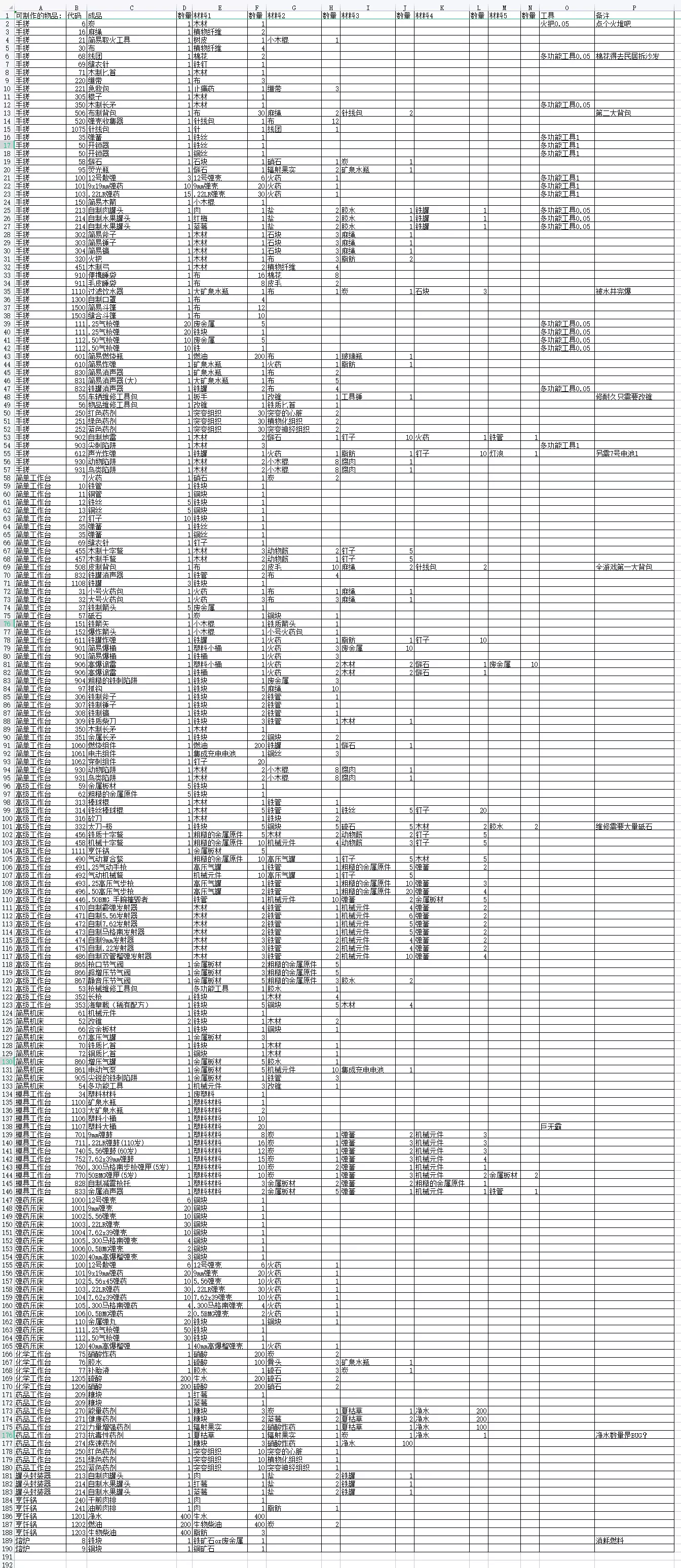 红圈+发亮的区域是疫病区,进入时要带好口罩并备好医疗包。另外,我个人没有在里面找到什么高价值道具。三、建筑及其解锁条件 建筑 材料1 数量 材料2 数量 材料3 数量 材料4 数量 材料5 数量 解锁科技需求 篝火 木材 4 石块 4 烹饪锅 烹饪锅 烹饪锅 1 铁管 4 石质熔炉 石块 10 石块 10(返还) 简单工作台 简单工作台 木材 8 石块 2 简易锤子 1 高级工作台 木材 20 钉子 20 铁质锤子 1 简易斧子 1 简易锤子 1(返还) 简易机床 砥石 5 粗糙的金属原件 30 粗糙的金属原件 10 化学工作台 木材 10 粗糙的金属原件 10 工具锤 1 矿泉水瓶 5 铁罐 5 粗糙的金属原件 10 药品工作台 木材 10 粗糙的金属原件 10 胶水 5 玻璃瓶 10 硝酸炸药 3 弹药压床 木材 10 粗糙的金属原件 20 钉子 10 简易锤子 1 粗糙的金属原件 10【罐头封装器】:硝石1、木材10、粗糙的金属原件10、钉子20、铁管5、肉20、盐20(腐烂亦可) 【模具工作台】:木材10、粗糙的金属原件10、金属板材10、烹饪锅1、废塑料10 【垃圾粉碎台】:木材10、废金属5 【水井】:木材10、粗糙的金属原件10、石块50、麻绳3 【简易镐】:5粗糙的金属原件10(可返还) 【单人床】:木材10、皮毛2 【枪店货架】:木材8、钉子10、画布 【标志牌】:木材10 【位置标记牌】:木材3 【储存箱】:木材4 【木墙门】:木材4 【靶子】:木材4 【木墙门】:木材4 【高木栅栏】:木材6 【木栅栏】:木材4 【锁柜】:铁块4 解锁子弹制造天赋分别需要:9mm 40发、7.62×39 30发、.300马格南16发、40MM榴弹5发 电气系统暂无意义,略。四、全武器列表 太长不看版: 顶级狙击步枪:山猫反器材狙、电磁轨道枪 顶级自动武器:M249、RPK 顶级近战武器:海皇戟、太刀极 近战: 木质匕首 铜质匕首 铁质匕首 撬棍 简易斧子 简易锤子 简易镐头 棍子 铁制斧子 铁制锤子 铁制镐 扳手 工具锤 消防斧 棒球棍 铁丝棒球棍 高尔夫球杆 砍刀 平底锅 武士刀风 武士刀血 太刀-极 木质长矛 金属长矛 长枪 海皇戟 远程: 雷明顿散弹枪 乌兹冲锋枪 MP5-K冲锋枪 AR-15突击步枪 贝雷塔ARX100突击步枪 格洛克17 史密斯威森929转轮手枪 鲁格10/22 KRISS Vector卡宾枪 柯尔特M1991 寻路者.22转轮手枪 鲁格GP100022 鲁格MKIV 2011ComdatMaster 洛洛克18(全自动) VSS微声步枪 B&T MP9 美洲(改装版).22全自动步枪 塔沃尔SAR突击步枪 M249通用机枪 AK47 鲁格M77步枪 MK47 RPK轻机枪 鲁格.300马格南栓动步枪 温切斯特70型步枪 GM6山猫反器材步枪 老式双管猎枪 简易猎枪 三管霰弹枪 手腕摧毁者霰弹手枪 打击者霰弹枪 电磁轨道枪 高能激光枪 特斯拉枪 老式双管霰弹枪 米尔科姆转轮连发式榴弹发射器 阿塔曼M2R气步枪 .50龙爪气步枪 镭射手炮 自制远程: 自制霰弹发射器 自制5.54 自制7.62 自制马格南发射器 自制9mm发射器 自制.22发射器 自制霰弹发射器 木制弓 木制十字弩 木制手弩 气动复合弩 气动机械弩 .25气动手枪 .25高压气步枪50高压气步枪 弹夹: 9mm弹夹 9mm弹鼓 5.56弹匣(30发) 5.56弹匣(25发) 9mm弹匣(17发) .22LR弹匣(10发) .22LR弹匣(20发) .22LR弹匣(30发) .22LR弹鼓(55发) .22弹匣(12发) .22弹匣(12发) 5.56弹鼓(60发) 5.56×45弹链(200发) 7.62弹匣 7.62扩展弹匣 7.62×39mm弹鼓 .300马格南步枪弹匣(5发) 50BMG弹匣(5发) 投掷: 破片手雷 燃烧瓶 破片手雷 简易炸弹 铁管炸弹 声光炸弹 简易炸弹 地雷: 简易地雷 简易爆桶 自制地雷 枪管枪口: 霰弹枪短管 9mm长管 9mm短管 步枪加长枪管5.56mm 贝纳利枪口抑制器 霰弹消音器 GMT 9mm消音器 欧米茄9mm枪口抑制器 GMT 5.56消音器 LUNAR 5.56mm枪口抑制器22消音器 简易消音器 简易大型消音器 铁管消音器 简易消音器 GMTECH7.62消音器 LUNAR7.62枪口抑制器 .300消音器 气枪枪口: 枪口节气阀 超增压节气阀 静音压节气阀 枪托 通用轻量化枪托 短柄(霰弹枪) CTR战术短枪托 CTR长枪托 木质长枪托 GMTECH便携枪托 一体式降噪枪托 气枪阀门(枪托): 增压气罐 电动气泵 瞄具: 红点瞄准镜 全息瞄准镜 2倍红点瞄准镜 4倍红点瞄准镜 2倍全息瞄准镜 4倍全息瞄准镜 PA6倍瞄准镜 猎人8倍瞄准镜 激光瞄准器 红色激光瞄准器 高效率蓝色激光瞄准器 注:本列表来自游戏目录内allitem.txt,可能有部分未实装。章首所述顶级武器都已经实装。 五、全生产配方 表格放不下了,直接上图。