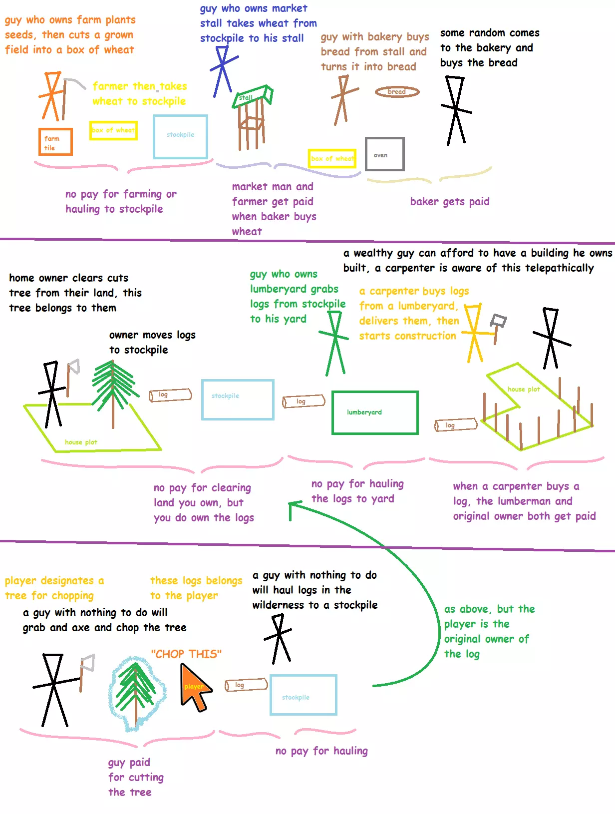 一张快速示意图,展示金钱如何以及何时转手。不包含具体细节,比如木匠何时能拿到施工报酬?我目前也不清楚 :P潦草笔记