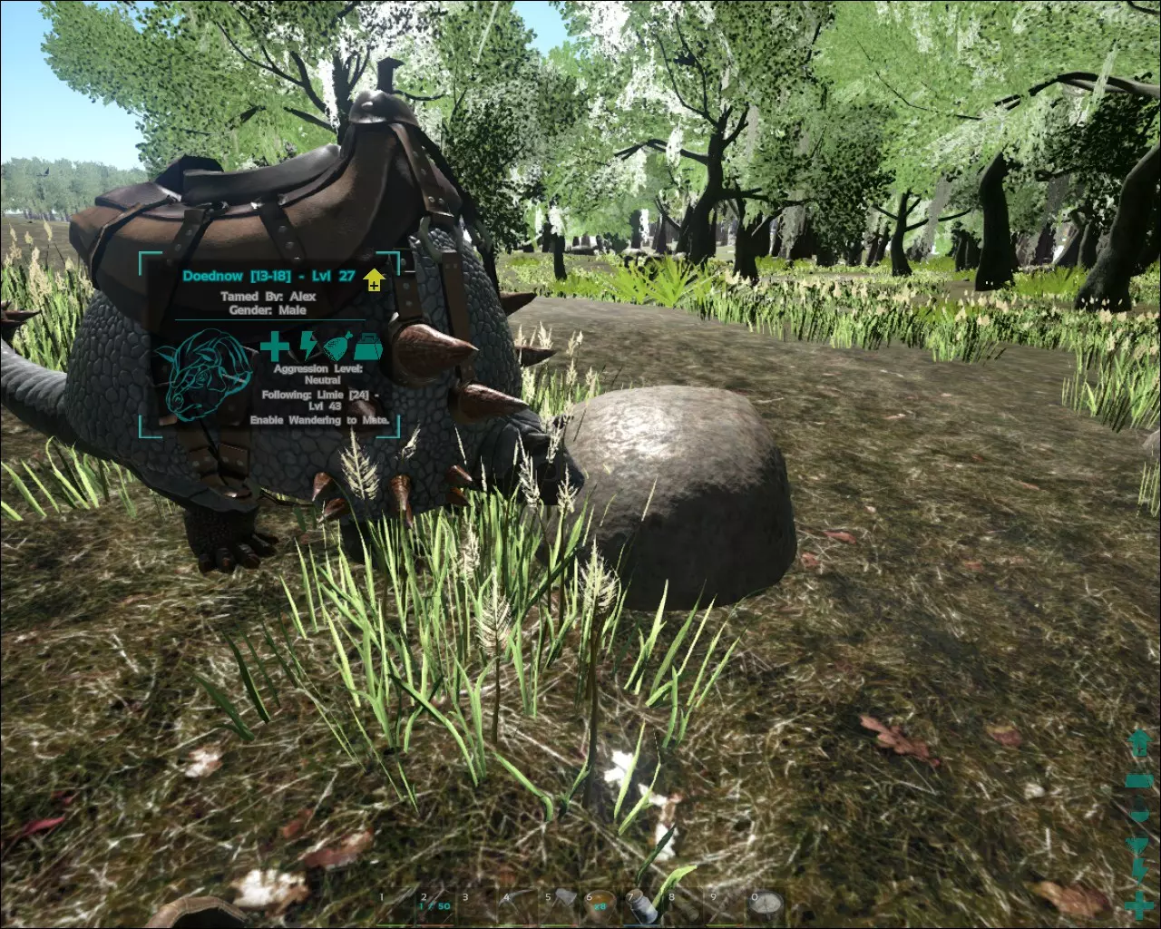 驯服方法与效率(是否让其挨饿) 这款游戏的一个主要问题是驯服时间过长。时间实在太久了。如果你缩短驯服时间,所需的资源量就会变得太少,这会让游戏过于简单。我建议至少将驯服速度提高2倍,甚至更多。我是离线游玩,所以可以中途休息,但对于在线玩家来说,这肯定非常无聊。 我还建议同时驯服多个生物,因为这很耗时。我上两次驯服时,一次驯服了3只甲龙、1只剑齿虎和1只阿根廷巨鹰,另一次同时驯服了5只巨齿鲨。一开始,我只是为了甲龙去的,因为我升到了40级,急需金属采集者,而且我知道它们的栖息地,但其他生物也加入了,所以我就把它们都打晕了。在击晕恐龙时,尽量让它们靠近一些。对于容易受惊的生物来说,这会比较麻烦,除非运气好,否则你很可能得一次只驯服一只。对于那些你能吸引仇恨的生物,只需将它们引到合适的位置就行。除了阿根廷巨鹰在倒下前飞远了一点之外,上述所有生物都靠得很近。 驯服时如果天色渐暗,要生一堆火,并用火把在周围区域巡视。你最不希望的就是被具有攻击性的恐龙突然袭击。另外,如果你有几只恐龙,把它们分散布置在该区域的周围。很多时候,我遇到迅猛龙、蝎子过来,它们没有攻击昏迷的生物,而是开始攻击我的宠物。双脊龙是你需要特别注意的,它们会优先攻击昏迷的生物,而不是你的宠物。驯服星尾兽是件麻烦事,因为它们需要大量箭矢才能击晕。它们的眩晕值高得离谱,而且像坦克一样皮糙肉厚。建议选择低等级的星尾兽,否则得带上50多支箭。 星尾兽和甲龙都能在相同的山区找到。如果你发现了甲龙,那么该区域很可能也有星尾兽。 注意:维基上关于星尾兽的描述有误。星尾兽不会采集黑曜石,采集黑曜石的是甲龙。 我犯了个错,很晚才驯服帝王蝎。帝王蝎的蛋可用于驯服霸王龙和蛇颈龙,但更重要的是,它是驯服风神翼龙的方法之一。 尽早驯服帝王蝎,并将所有属性点都加在攻击力上,留着用来驯服风神翼龙。迅猛龙:你的第一个像样的坐骑,不过无法承载重物,所以你得经常清空背包。而且即便你不让它们拾取,它们似乎还是会去捡东西。我猜它们有点好斗。我并不喜欢我的迅猛龙坐骑,但由于缺乏了解,我一直用到40多级。它们的蛋是制作可爱猛犸象所需的材料,所以要抓母的。用优质生肉很容易驯服它们,但如果你想用饲料驯服,就需要先驯服副栉龙。 翼龙:必备坐骑。它是你的第一只飞行坐骑和侦察兵,能让你轻松获取稀有的山地资源。对于6级及以下的个体,用弩瞄准它的额头一箭就能搞定,或者用弓射1-2箭。 你也可以利用它来吸引阿根廷巨鹰,把它们引到你的基地附近,这样你就能轻松将其击晕并驯服。到了后期,有了更大的飞行恐龙后,你可以抓起这些恐龙,把它们扔进笼子里,然后按自己的节奏进行驯服。 魔鬼蛙你能一次性击晕多少就能驯服多少。我曾经因为它是只青蛙而迟迟没有驯服,要是早知道就好了。我在20多级的时候驯服了一只,因为我受够了那些讨厌的昆虫。最后我驯服了好几只。我用6只等级不到30级的【魔鬼蛙】就能轻松杀死一只30多级的霸王龙,对付雷龙则稍微棘手一点。我已经用它们杀死过好几只霸王龙了。剑齿虎在战斗中几秒内就会阵亡,而这些青蛙却能持续战斗。它们能用舌头将攻击者控制在一定距离外,这让它们变得非常强力。不过我傻到40多级才给它们做鞍,真是个错误。当你骑着它们跳跃时,陆地上没有任何动物能追上你,而且它们速度很快,骑乘体验也很有趣。在负重方面,它们能轻松承载你和你的物品。此外,它们还是出色的游泳健将,能比任何生物都更持久,目前我用它们作为海洋采集的坐骑。它们游泳的一大优点是不需要消耗耐力,而且只有一个速度——非常快!唯一的问题是它们在水下不会攻击,但确实能(真的)绕着其他生物跑圈。我正考虑用一只沿着海岸线游向雪 biome,它们就是那么快。 渐新象:你的第一个平台坐骑。必备品,因为它能让你拥有一个可移动的基地。相对容易驯服。最好使用弓作为武器,这样你可以边跑边射。用十字弩的话装填时间太长,而且装填时无法奔跑,这会让你轻易成为速度较快的渐新象的目标。 只是要小心,尽量引一只单独的渐新象,并把它从其他同类身边拖开,否则就先杀掉除目标之外的所有同类。 雷龙:出于和渐新象相同的原因,用弓将其击晕。和驯服雷龙时一样,你要尝试自己找到它,并且清除该区域内所有受到攻击时会选择战斗而非逃跑的生物,因为它挥击的尾巴会激怒很多恐龙。 我还是建议一次驯服不止一只生物。我当初是在尝试驯服那只28级雷龙时一时兴起才驯服了它,那只雷龙驯服后升到了37级(我记得是)。在查看了在线计算器后,我意识到驯服它需要很长时间,于是决定去驯服其他一堆生物,而不是坐着干等。最后我驯服了2只雷龙、3只雌性剑龙和1只雷龙。最后醒来的是那只28级(变成37级)的雷龙,然后是那只2级的低等级雷龙。情况还不算糟,而且它就在我的基地旁边,我还有一个剑龙农场,所有需要的物品都有。这些照片是从一只昏迷的剑龙身上拍的。驯服效率 驯服效率越高,恐龙获得的等级就越多。这受驯服速度以及恐龙昏迷后是否被攻击的影响。显然,越是偏好的食物,驯服速度就越快,驯服效率也就越高。因此,对于几乎所有恐龙来说,【饲料】都是最佳选择。如果想获得最佳效果,就要准备合适的食物并