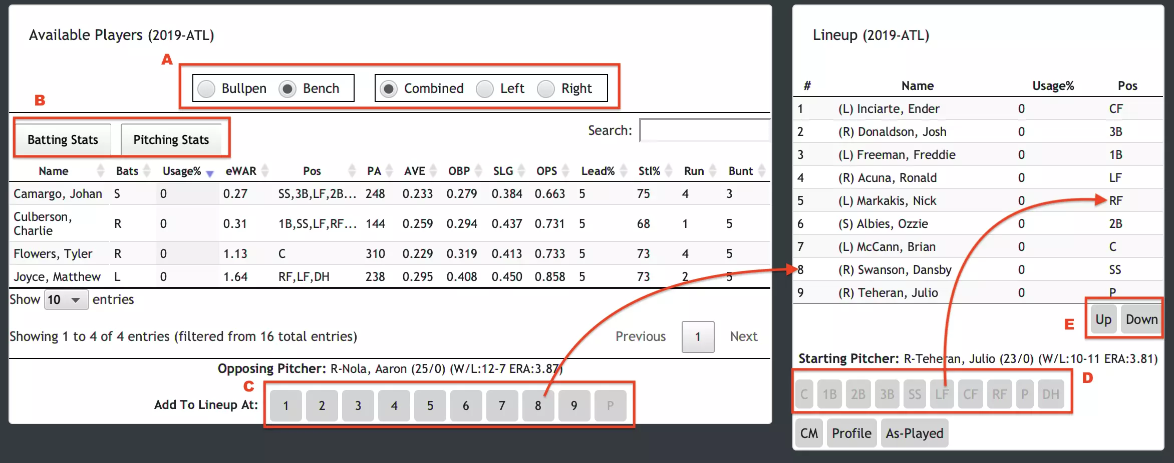 阵容管理工具 在《数字钻石棒球》中,有多种情况需要创建或编辑阵容。例如,赛前编辑首发阵容、比赛中进行阵容调整,或在球队资料中设置默认阵容。在所有这些情况下,你都将使用阵容管理工具。下方为阵容管理工具的注释图片: