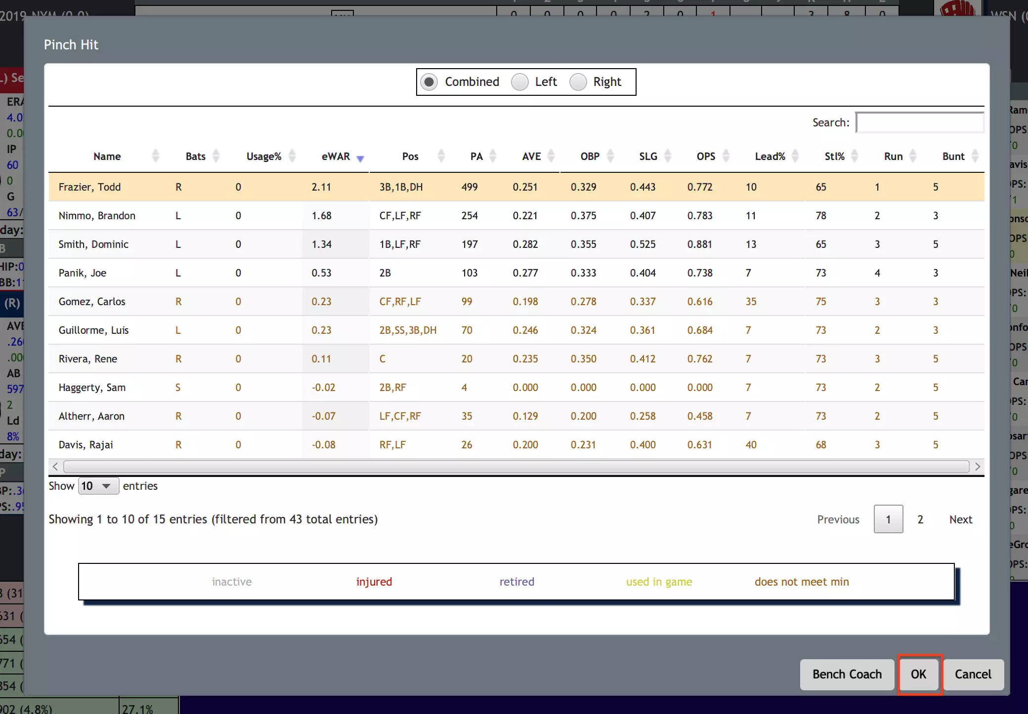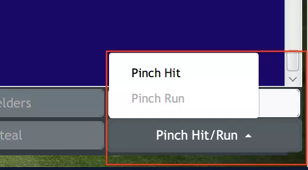 这将调出当前进攻队伍的替补席。点击你想要进行代打或代跑的球员,然后点击确定。如果你要进行代跑且垒上有多名跑垒员,系统还会要求你指定要为哪位跑垒员进行代跑。