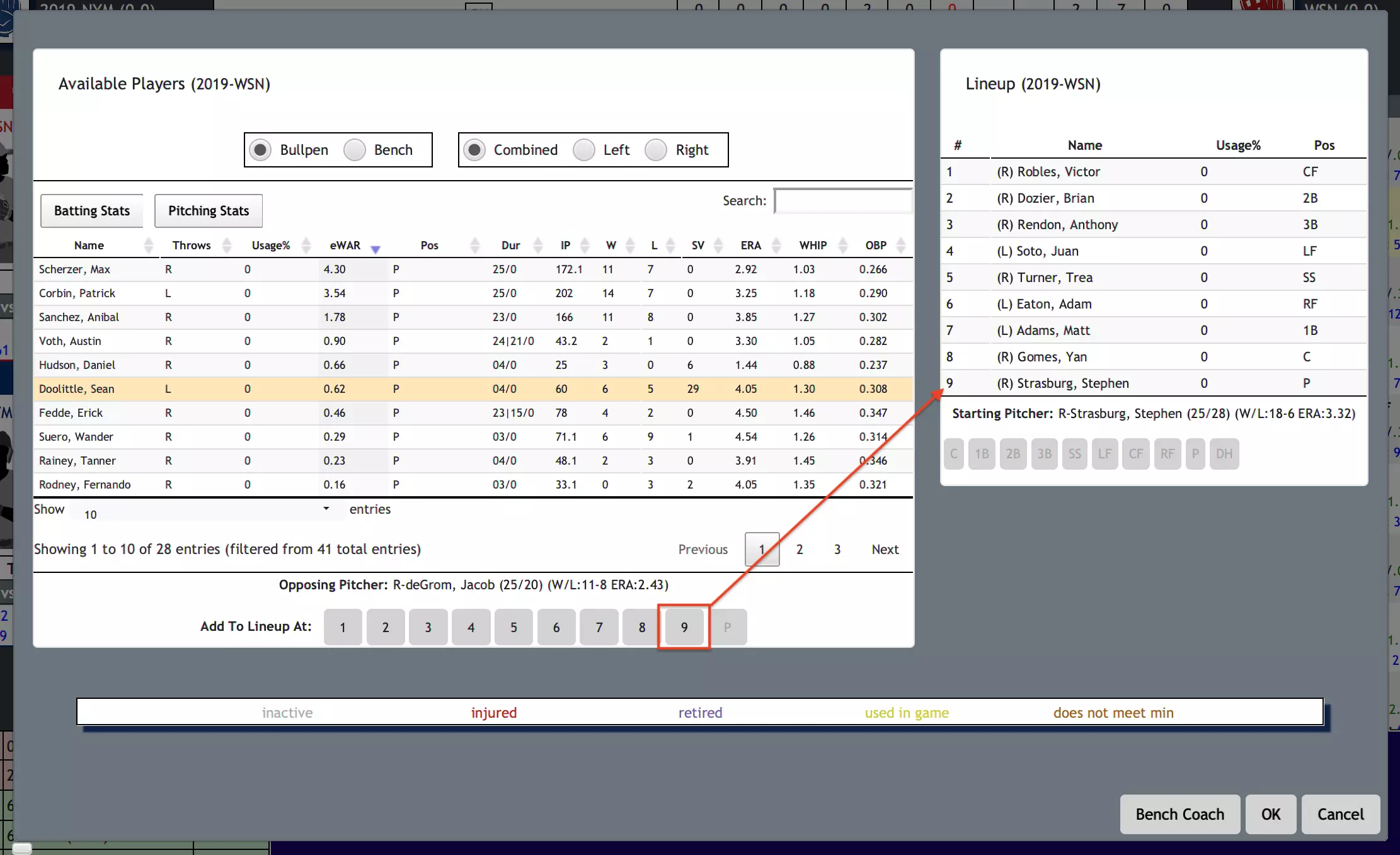 此功能将显示阵容管理工具,其中包含两个球员表格。左侧表格会显示防守方的牛棚投手,右侧表格则显示防守方当前的阵容。若要更换中继投手,需先在左侧选择想要换上的投手。接着,在牛棚表格底部点击代表你想要插入该投手的阵容位置编号。如果是没有指定打击手(DH)的比赛,通常你需要点击当前由投手占据的阵容位置,该位置通常是第9位,此时点击数字9即可。如果是有指定打击手的比赛,你应点击牛棚表格底部的P(投手位置标识)。
