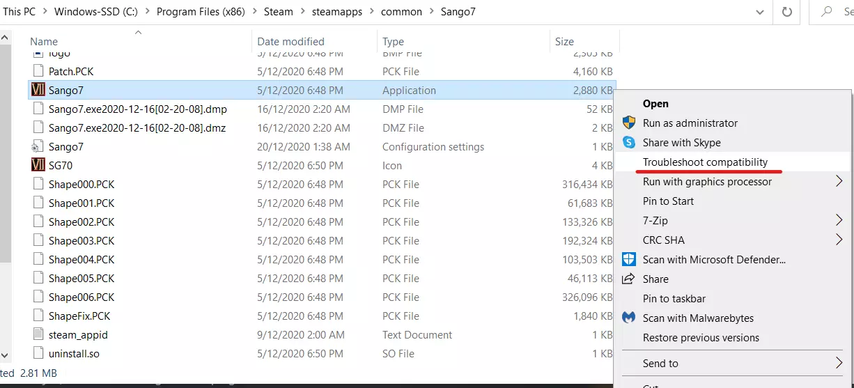 4. 右键点击“Sango7”(.exe)应用程序文件 > 选择“兼容性疑难解答”