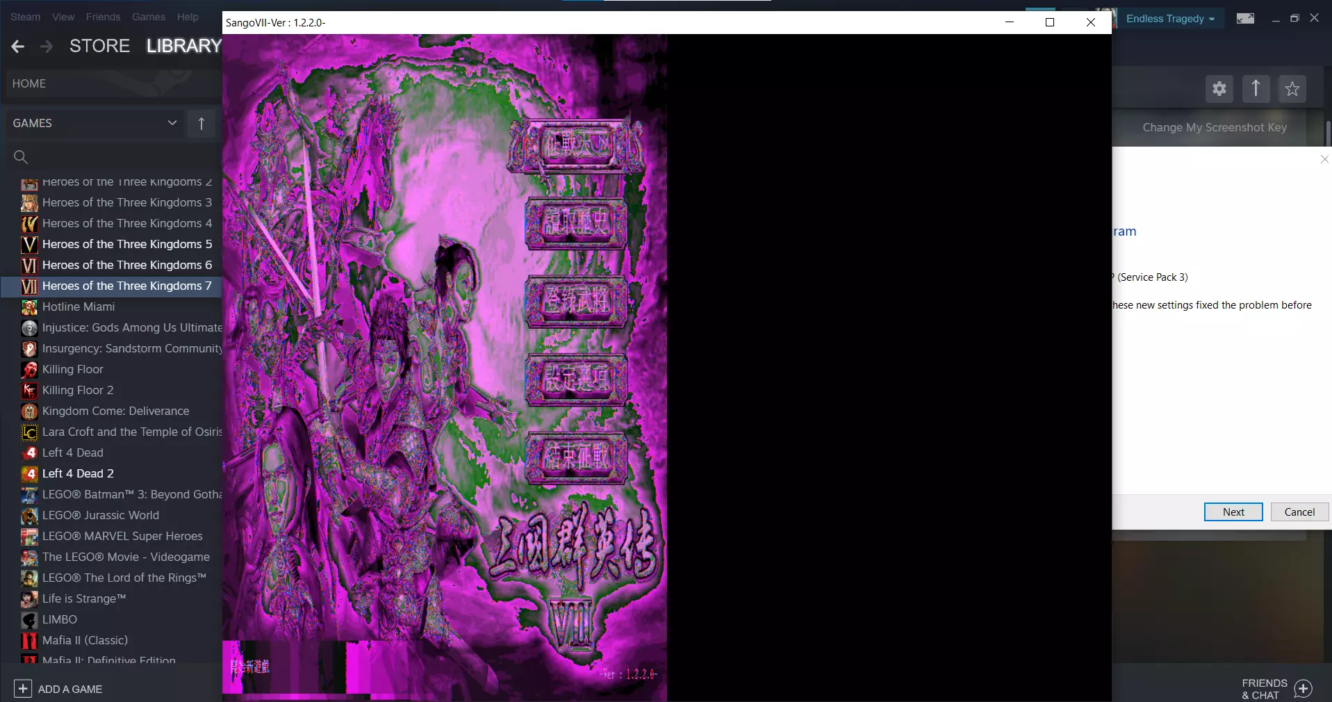 游戏应该可以玩了 中文(常见问题与相应解决方法汇总)(归功于LuckyNarcissu) 中文(归功于LuckyNarcissu)常见问题与相应解决方法汇总 Q1:片头、片尾CG无法自动播放 A1:需要下载Indeo Codec编解码器 Q2:游戏中切换至其他应用程序再返回会导致花屏 A2:花屏时按Alt+Enter键窗口化,再按一次Alt+Enter键重置全屏 Q3:全屏游戏时屏幕两侧有黑边 A3:按Windows+R键打开运行,输入regedit打开注册表,定位到HKEY_LOCAL_MACHINE------SYSTEM------ControlSet001-------Control-------GraphicsDrivers-------Configuration,右键点击Configuration,选择查找并输入Scaling,在右框内找到Scaling并右键点击选择修改,将数值4修改为3,点击确定保存即可 Q4:游戏不能窗口化运行 A4:两种解决方法①:使用官方发布的窗口化工具。 ②:打开游戏文件夹,右键Sango7.exe选择属性-兼容性,勾选「以兼容模式运行这个程序」,选择Windows XP(Service Pack 3);勾选「简化的颜色模式」,选择16位(65536)色,点击确定退出。打开Sango7.ini,修改第7行为m_bFullScreen = 0、第6行为m_bBGActive = 1,保存退出即可。 Q5:登陆武将输入文字乱码 A5:可以使用QQ拼音,右键工具栏调整输入模式为大五码即可正常输入文字。如果仍然出现乱码现象,可在游戏内打字弹出输入框,右键输入框再次调整输入模式为大五码(搜狗拼音同理) Q6:字形选择无反应