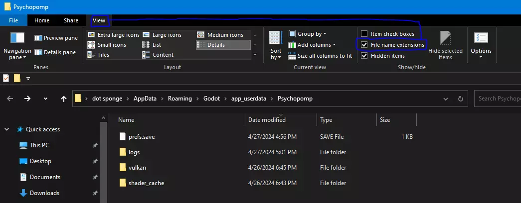 太棒了!如果你想重启游戏或进行其他操作,可以把这个保存到安全的地方。 对了,有个你应该做的小技巧。 尤其是当你手动通过Windows资源管理器导航到存档位置却看不到Appdata文件夹时。 如果你的prefs.save文件后面没有显示".save"扩展名,那你就需要这样做: 查看Windows资源管理器顶部,点击“查看”选项。勾选“文件扩展名”。 同时,你也可以勾选“隐藏的项目”,这样就能显示隐藏文件(比如AppData)了。
