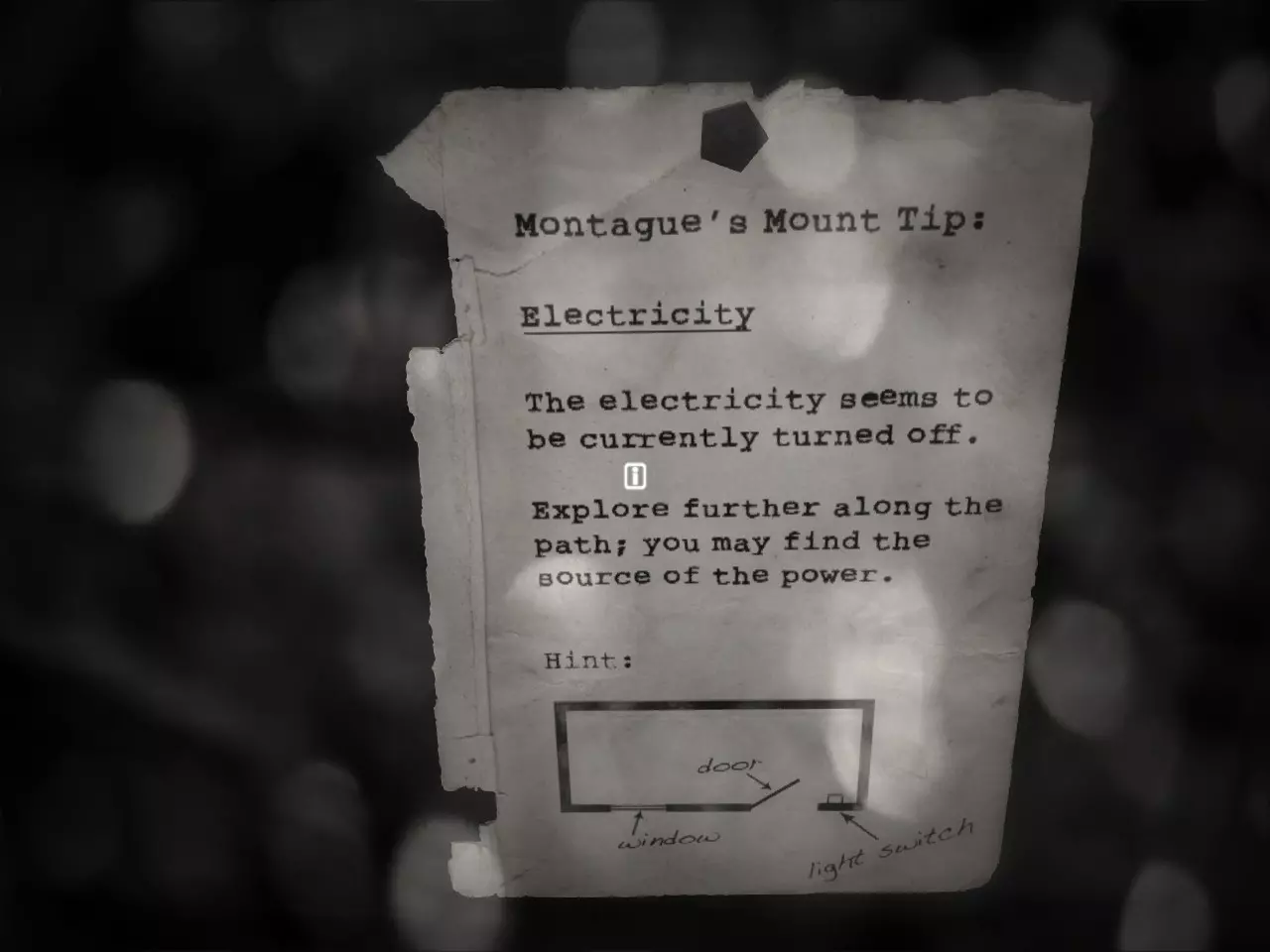 电力 《蒙塔古的山丘》提示: 电力 目前电力似乎已关闭。 沿着小路继续探索,你或许能找到电源。 提示: [图表]窗户、门、电灯开关