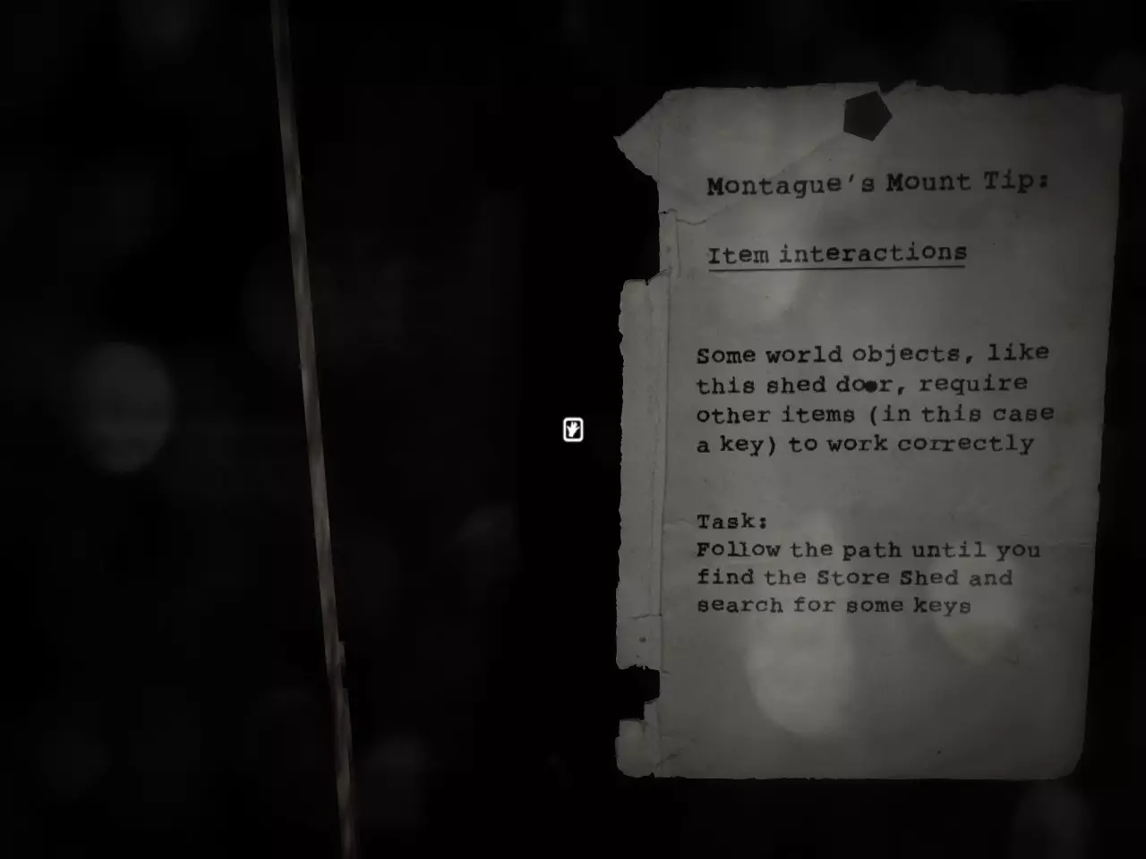 物品互动 《蒙塔古的山》提示: 物品互动 部分场景物品,例如这个棚屋门,需要其他物品(此处为钥匙)才能正常使用 任务: 沿着小路前进,找到储物棚并搜寻钥匙