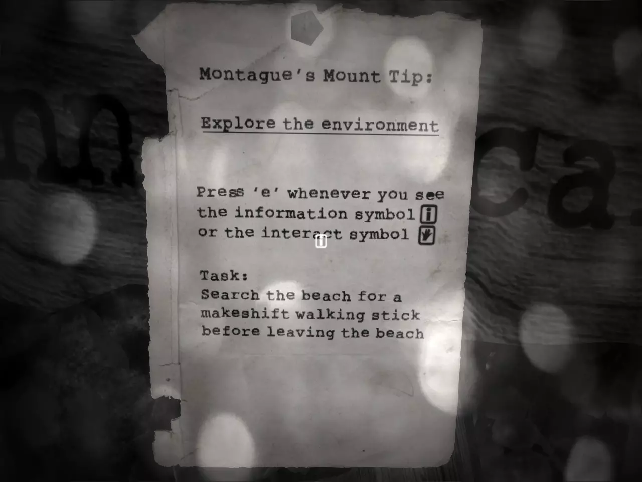 探索环境 蒙塔古的山提示: 探索环境 当看到信息符号[i]或互动符号[手]时,按“e”键 任务: 离开海滩前,在海滩上寻找一根临时手杖