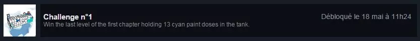 解锁挑战1:在持有13剂量青色颜料的情况下,赢得第一章最后一关。 挑战1修改 本指南将帮助你解锁成就Challenge n°1,该成就在正常情况下无法完成。 前往SteamApps common Ubinota data niveau并打开World 10。