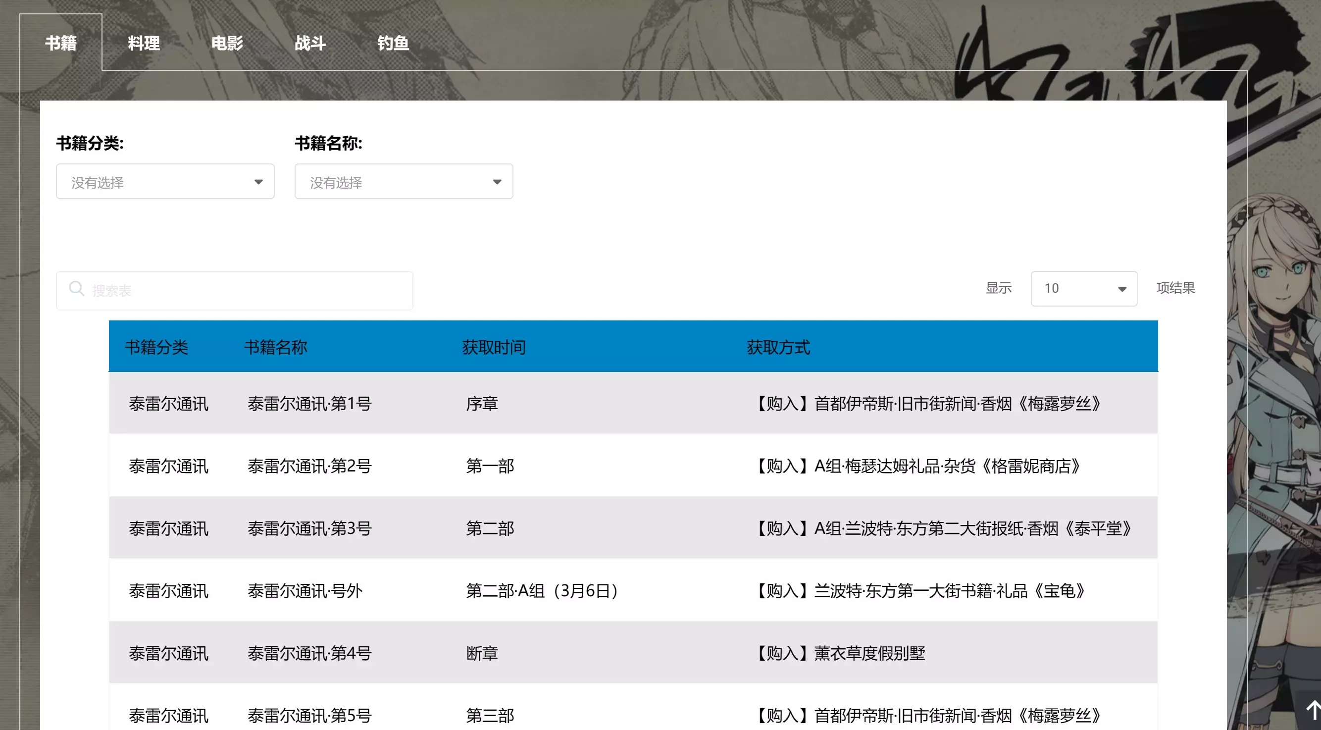 全笔记 书籍、料理、电影、战斗、钓鱼笔记。其中战斗与钓鱼笔记仍在制作中。