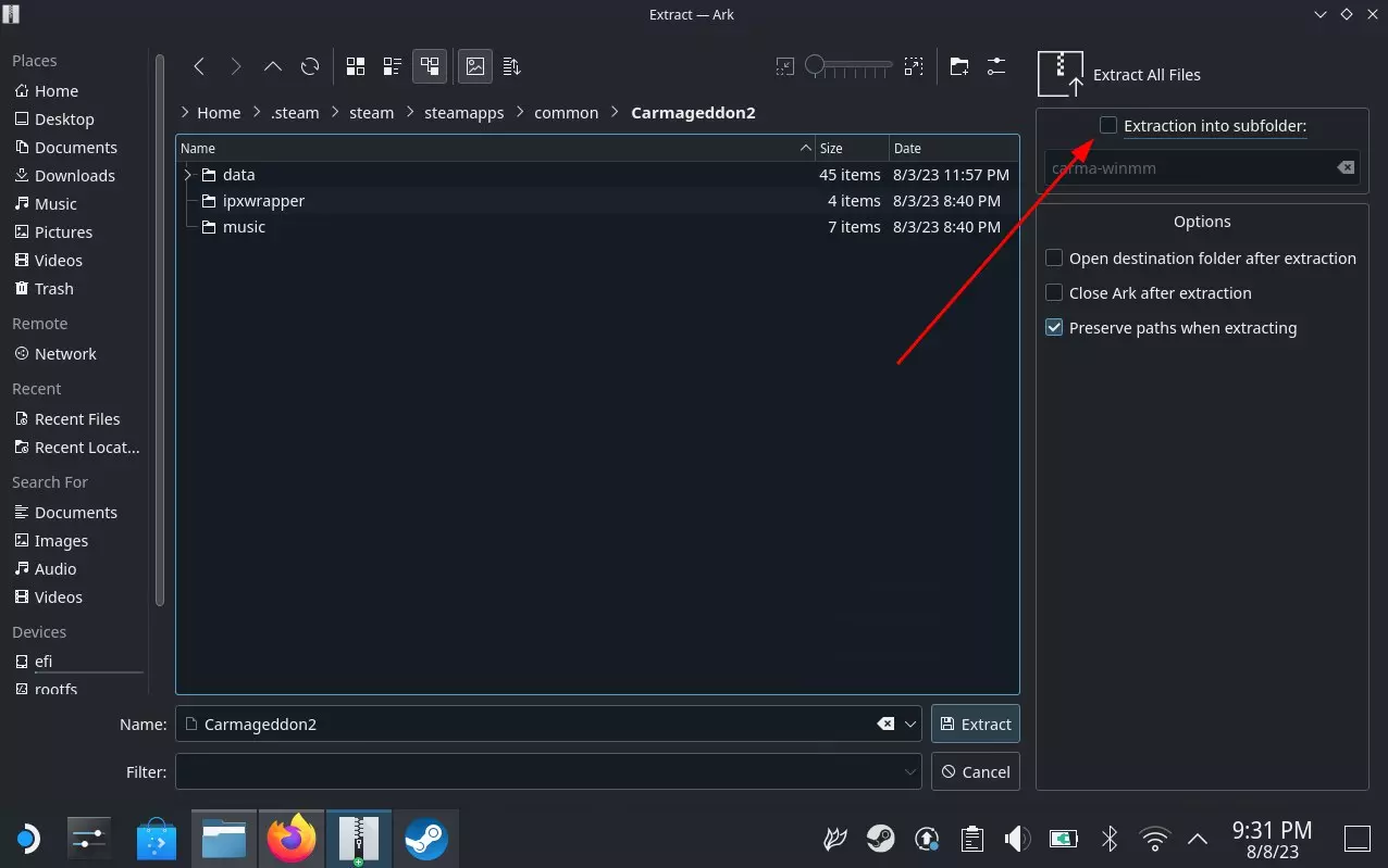 然后在左侧【位置】选项卡中选择【主页】,并导航至.steam → steam → steamapps → common → Carmageddon2。这里【重要】:取消勾选【提取到子文件夹】选项,然后点击【提取】。