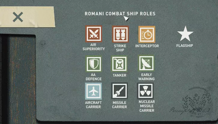 舰船等级标注在舰船名称下方的红色文本中。 按质量划分等级 舰船等级由两部分组成——以塞瓦斯托波尔级为例,第一部分是“战略级”,表明其总体用途;第二部分是“重型巡洋舰”,表明其吨位级别。 对于第二部分(如塞瓦斯托波尔级的“重型巡洋舰”),游戏会根据舰船质量分配相应等级,具体如下: 0-1000吨:轻型护卫舰; 1000-2000吨:护卫舰; 2000-3200吨:重型护卫舰; 3200-5000吨:驱逐舰; 5000-7000吨:重型驱逐舰; 7000-10000吨:轻型巡洋舰; 10000-20000吨:巡洋舰; 20000吨以上:重型巡洋舰。 在初始舰船设计中有一个例外:科莫兰级的质量为10551吨,对应“巡洋舰”等级,但被指定为“轻型巡洋舰”。不过,如果你将Kormoran(科莫兰)加载到编辑器中,并以其他任何名称保存,其类别将如预期更改为“巡洋舰”。 按用途划分的类别 对于第一部分(以塞瓦斯托波尔为例的“战略级”),游戏有5种可能的类别,分配的类别还会定义舰船卡片的颜色(在新游戏界面中,不同颜色卡片上会列出可用舰船)。以下是这些类别以及舰船被分配到其中一类的规则: 如果舰船拥有至少1个配备Kh-15、A-100或R-3(或其任何改进型)的导弹发射井,则该舰船被视为“战略级”(黑色卡片),无论其安装了其他什么装备。 如果舰船不是“战略级”,且拥有至少1架飞行器,则该舰船被视为“航母级”(蓝色卡片)。若舰船非【战略舰】或【航母】,且速度超过450千米/小时,则该舰船被判定为【截击舰】(黄色卡片)。 若舰船非【战略舰】、【航母】或【截击舰】,且航程超过2000千米,则该舰船被判定为【辅助舰】(绿色卡片)。 若舰船非【战略舰】、【航母】或【截击舰】,且航程未超过2000千米,则游戏会对比其角色数值。若【防空】+【加油机】+【预警】的数值之和大于【制空权】+【打击舰】+【截击机】的数值之和,则该舰船被判定为【辅助舰】(绿色卡片),否则被判定为【攻击舰】(红色卡片)。 按角色分类 是的,上文已提及【角色数值】。舰船角色是9种舰船属性,以带有对应数值的图标形式显示,用于体现舰船对特定任务的适配程度。在新游戏界面中,将鼠标悬停在舰船卡片上时可以查看角色数值。同时,舰船图片会被替换为数值最高的角色,并附带简短描述说明该角色舰船可执行的任务(例如,塞瓦斯托波尔被描述为“加油机”)。部分舰船可能有两个(或更多)数值相同的角色(例如,芬内克在“防空”和“早期预警”上均为2)。这种情况下,游戏将按照以下顺序显示优先级更高的角色:制空 > 攻击舰 > 拦截机 > 防空 > 加油机 > 早期预警 > 航空母舰 > 导弹舰 > 核导弹舰。