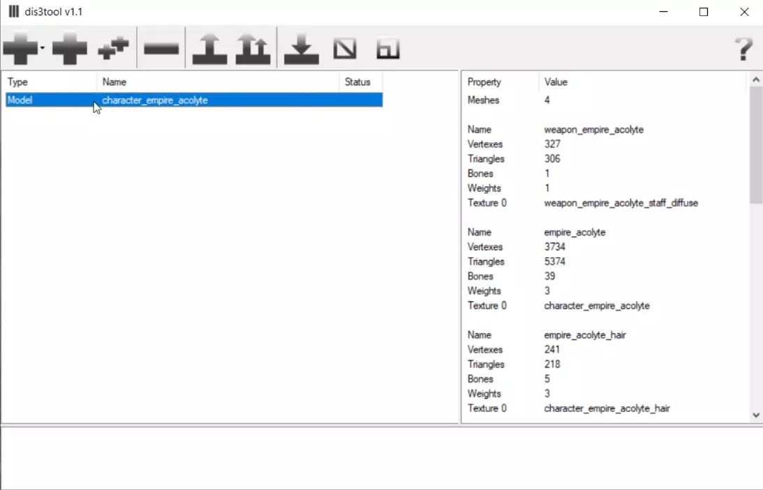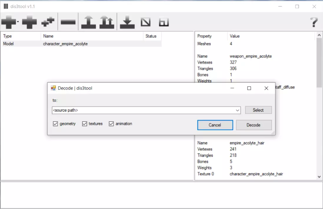 关于将游戏格式的3D模型解码为常用格式以便在3D编辑器中打开的指南 前言 该工具包具备打开.scene文件并将3D模型导入已打开场景的功能,但遗憾的是,它没有将游戏格式的3D模型数据解码为常用格式的功能。因此,将游戏3D模型解码为常用3D对象数据格式的唯一方法是使用Dis3tool。 完整3D模型数据提取 本指南假设你已从resource*.vdpack和resource*.vdpath文件中提取了所有游戏资源,并且你的电脑上已安装Blender 3D编辑器。 解码游戏3D模型:启动Dis3tool 点击“添加”按钮