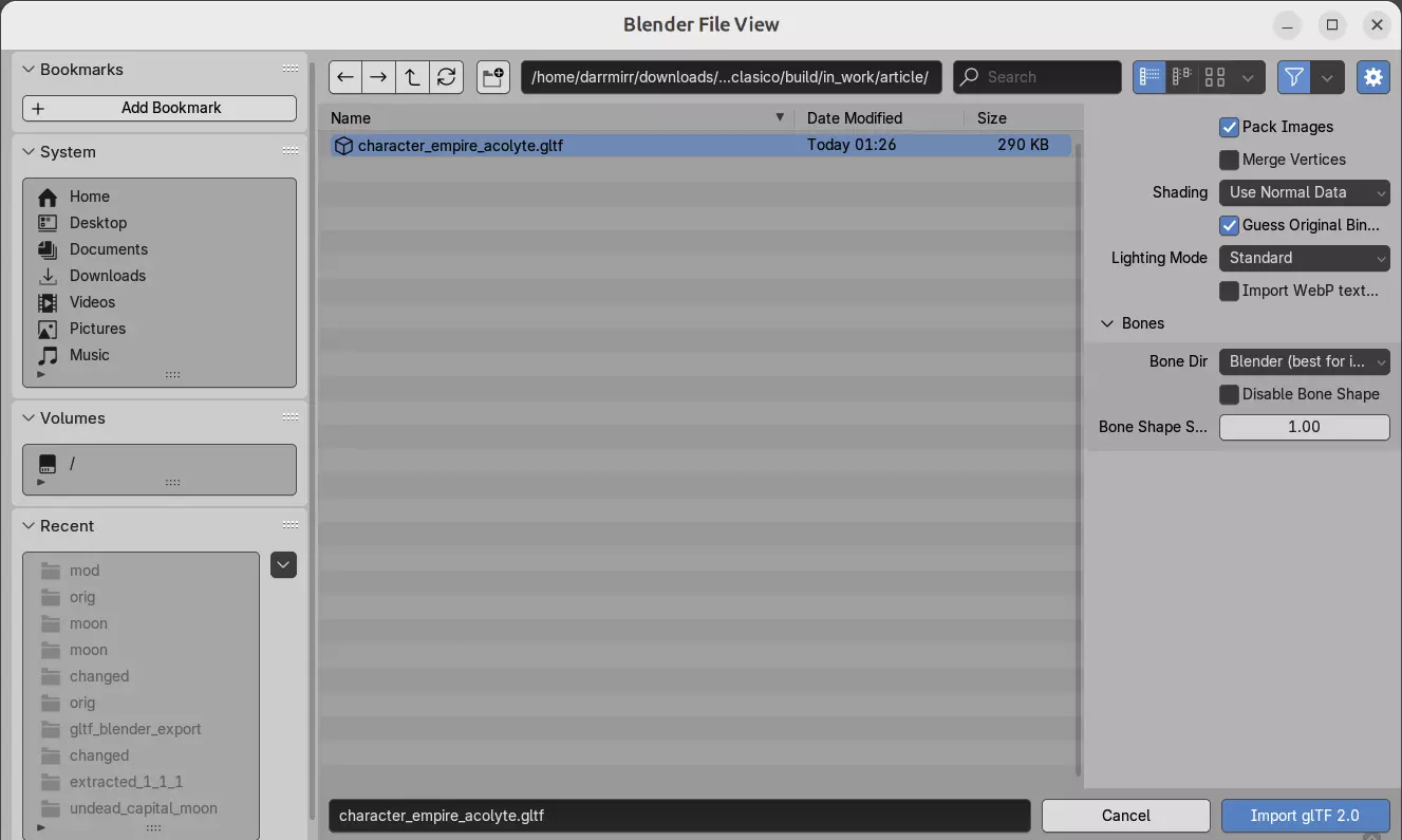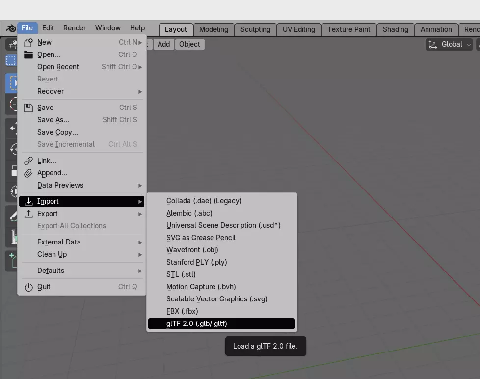 Dis3tool会解码3D几何数据,并将结果放置在源文件所在的同一目录中。 在Blender中打开解码后的3D几何模型:启动Blender,点击“文件”菜单,然后选择“导入->glTF 2.0”子菜单项。