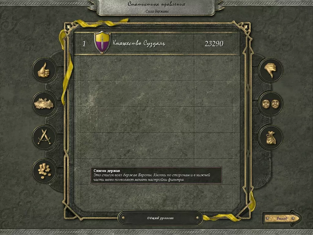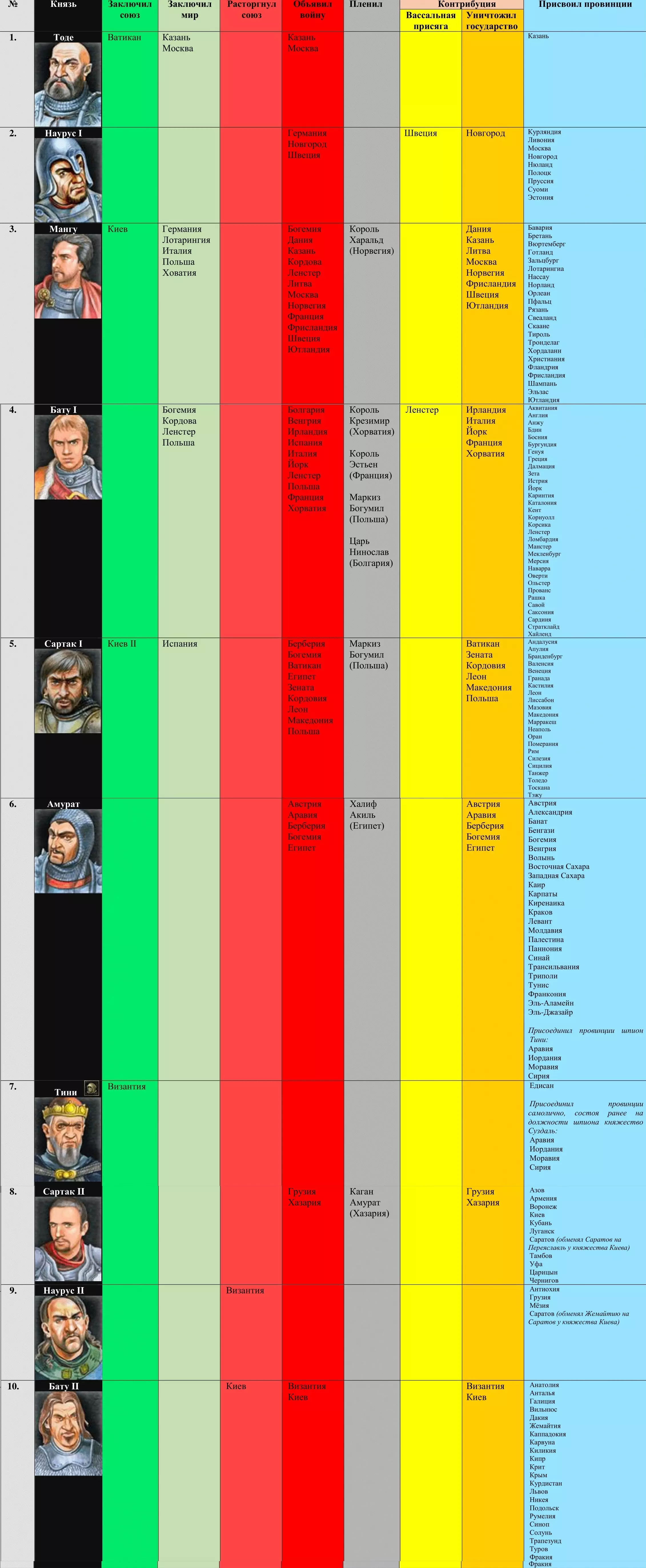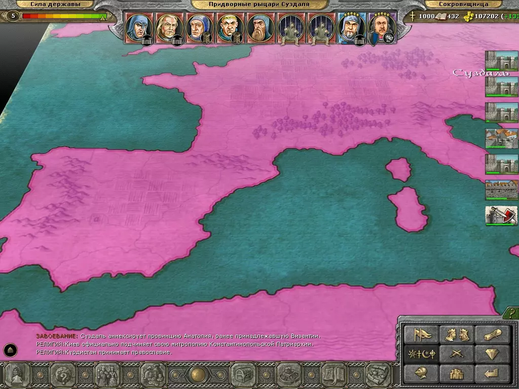 最令人印象深刻的是: 1. 第七位公爵,此前曾是宫廷间谍(作为未继承王位的次子继续担任间谍),亲自将整个阿拉伯国家(由四个省份组成)并入自己的公国。他设法在为阿拉伯效力期间成为其国王,随后成功将王冠献给了苏兹达尔公国。接下来,由于这名间谍的堂侄王子没有留下继承人,间谍最终还是成为了王子,继承了王冠。 2)第十位(最后一位)王子天赋异禀,所有属性都是三星满星。我不记得之前在游戏中诞生过这样的王子。3) 公爵的名字显然完全不符合苏兹达尔地区的特点。如果在莫斯科、基辅能看到安德烈、亚历山大、巴维尔这类名字,那么苏兹达尔的名字与该公国并不匹配。 4) 整个地图(欧洲和非洲北部地区)完全变成了东正教。