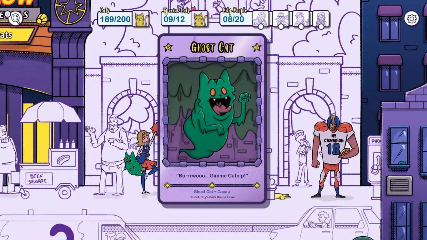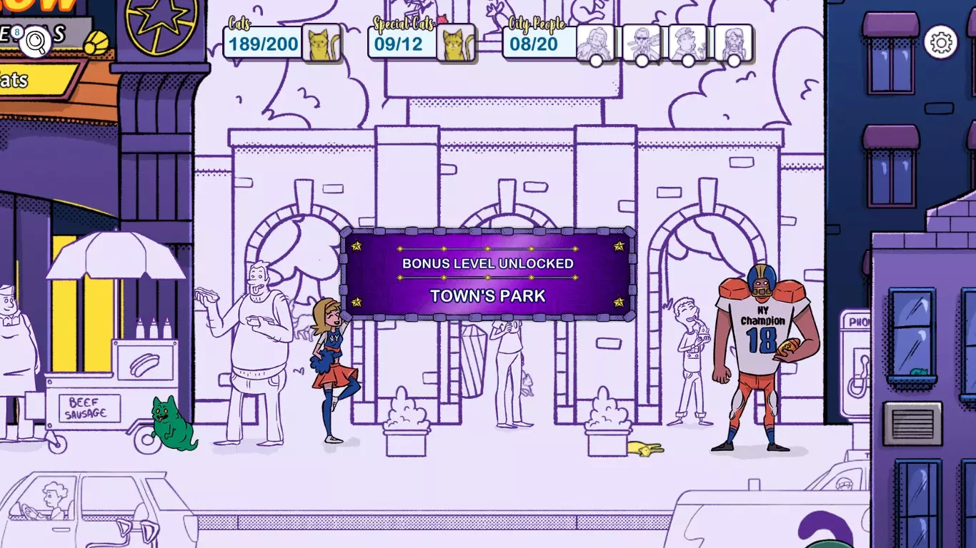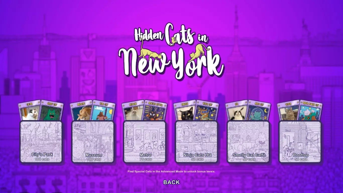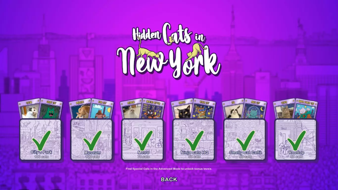 详细的截图会向你展示所有奖励关卡中隐藏猫咪的位置。这将帮助你解锁6个额外的游戏成绩。 解锁奖励关卡 你首先需要游玩纽约高级模式,并找到12只隐藏的特殊猫咪。