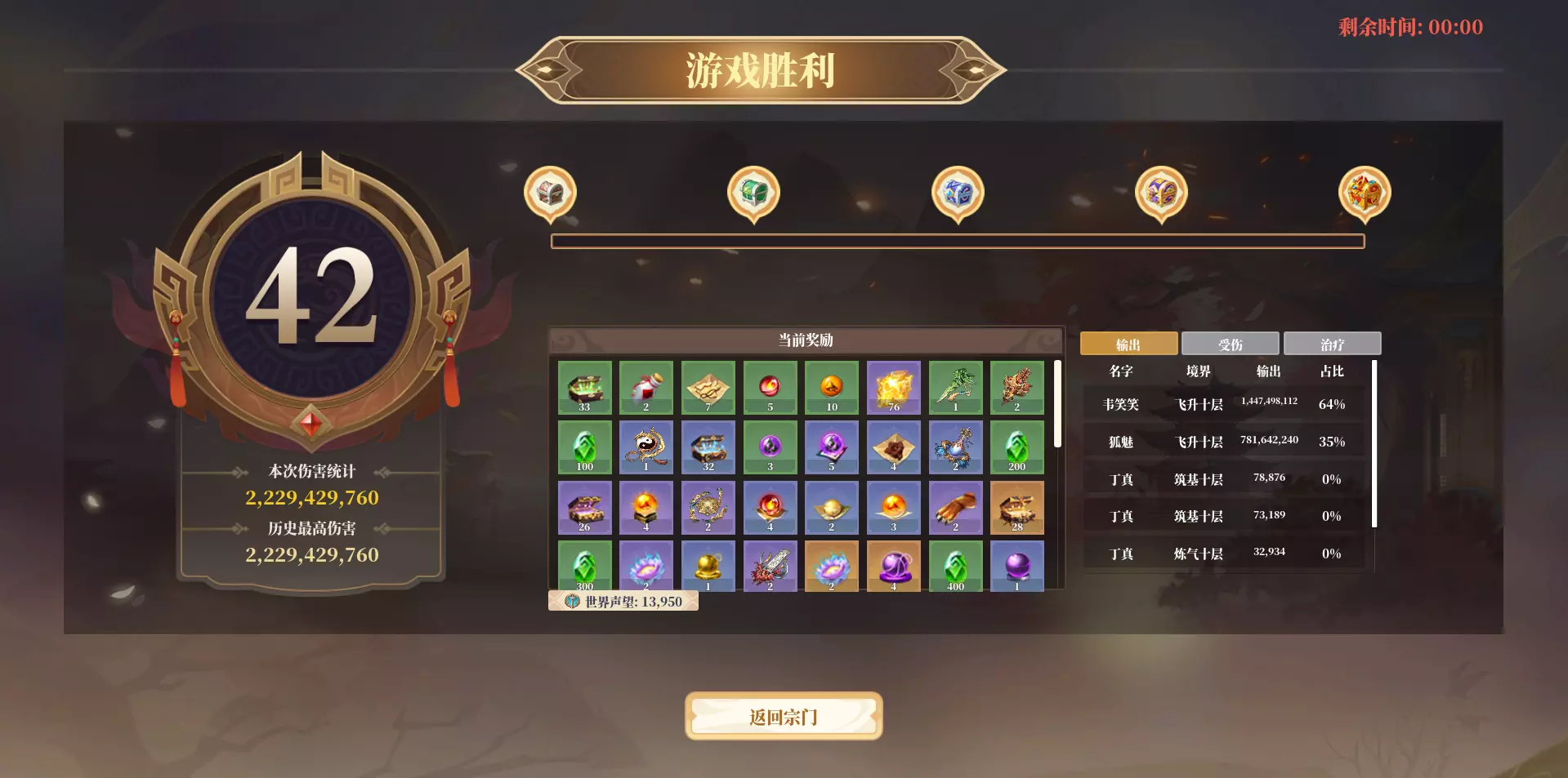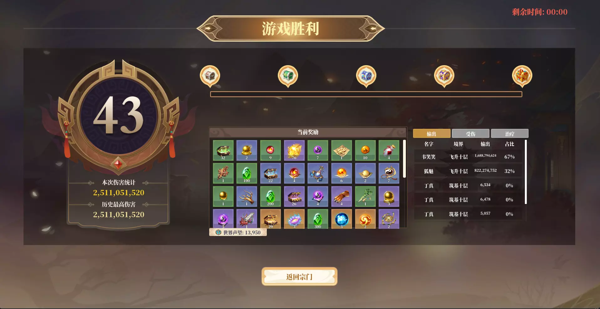 装备推荐及伤害展示 掌门未经过重生,佩戴装备为非爆伤刀、仙魔甲、金环履